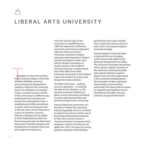 hroughout its short but exciting history, Vytautas Magnus University has been faithfully nurturing and continuing its distinguished traditions. What sets this university apart is its willingness to organize studies, scientific research and life of the community in a different way. Intellectuals from Lithuania and abroad have participated in the reestablishment of VMU and defined its goals, which are being pursued to this day. Here, utmost importance is given to aesthetics, honesty, tolerance, dialogue and the ability to think independently, while the forerunning principles are liberal and democratic. Creativity, progress and development of national culture are all brought into sharp focus.