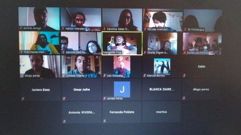 El encuentro de líderes y lideresas de la Región de O’Higgins, reali zada a través de la plataforma Zoom, fue una instancia de transfe rencia de aprendizajes que contó con la participación de los líderes que forman parte de la red de líderes sociales de la fundación. Los relatos estuvieron protagonizados por las lideresas de la comuna de Pumanque, Margarita Cruz, y de la comuna de Pichidegua, Frans heska Meneses, quienes relataron experiencias de participación comunitaria. En este encuentro participaron también, profesionales Servicio País y el equipo regional. El espacio tuvo una alta valora ción entre los participantes, quienes participaron activamente en una dinámica participativa diseñada por el equipo regional.