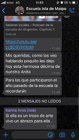 Anita Irarrázaval, perteneciente a la red de líderes y lideresas, participó en el módulo “Saberes loca les” de la Escuela de dirigentas en temáticas socio ambientales y territoriales, a cargo del Observatorio de Desigualdades de la Universidad Diego Portales, la FUSUPO y el COES, que congrega a dirigentas de las comunas de Til Til, María Pinto, Alhué y San Pedro de Melipilla. En esta oportunidad Anita Ira rrázaval fue parte del primer podcast de la Escuela, donde compartió y dio a conocer lo aprendido en la escuela de lideresas a través décimas. Producto de la pandemia, la escuela de dirigentes tuvo que innovar en su formato, por lo que los contenidos han sido compartidos a todas las dirigentes a través de grupos de whatsapp.