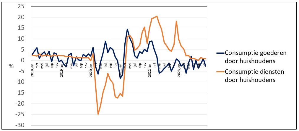 Figuur 2. Procentuele wijziging in de consumptie van goederen en diensten door huishoudens in Nederland. 2018-2023 (2020-2023: voorlopig). Bron: CBS/Statline.