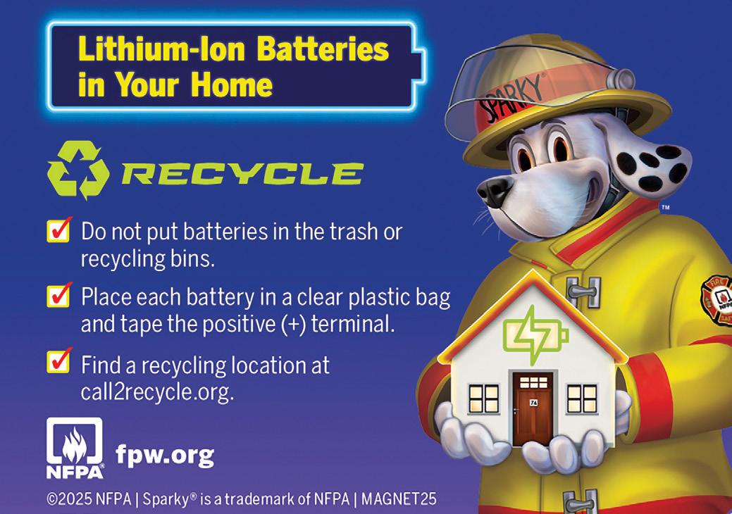 The theme of this year’s National Fire Protection Association Fire Prevention Week is “Charge into Fire Safety” and relates specifically to Lithium-Ion Batteries in the home. The NFPA recommends buying Lithium-Ion Batteries containing a safety certification, such as a UL marking, which means they meet certain safety standards. The NFPA also recommends charging Lithium-Ion Batteries with manufacturer-approved cords and chargers and asks that batteries be unplugged once fully charged. Lastly, the NFPA asks that Lithium-Ion Batteries be disposed of properly, which means they should not be disposed of in regular trash or recycling bins. Please dispose of unwanted batteries at approved safe battery recycling centers or at Niles Public Works electronic recycling events. For more information on locating a safe battery recycling center please visit call2recycle.org.