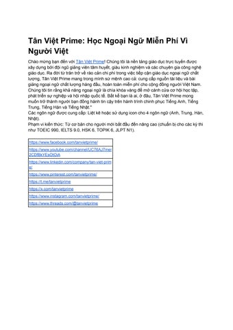 Chào mừng bạn đến với trang Issuu chính thức của Tân Việt Prime! Chúng tôi là nền tảng hàng đầu cung cấp các tài liệu học ngoại ngữ (Tiếng Anh, Tiếng Trung, Tiếng Hàn, Tiếng Nhật) chất lượng cao, hoàn toàn miễn phí. Với sứ mệnh mang tri thức ngôn ngữ đến gần hơn với mọi người, đội ngũ giáo viên giàu kinh nghiệm của chúng tôi biên soạn và chia sẻ các ấn phẩm giá trị nhằm hỗ trợ hiệu quả cho quá trình học tập của bạn. Tại đây trên Issuu, bạn có thể dễ dàng đọc và tải về các loại tài liệu như: Ebook Ngữ pháp và Từ vựng: Tổng hợp kiến thức từ cơ bản đến nâng cao. Cẩm nang Luyện thi: Chiến lược và mẹo chinh phục các kỳ thi quốc tế (IELTS, TOEIC, HSK, TOPIK, JLPT). Tài liệu Bài tập & Thực hành: Giúp củng cố kiến thức và rèn luyện kỹ năng. Cẩm nang Văn hóa & Giao tiếp: Hiểu sâu hơn về ngôn ngữ qua lăng kính văn hóa. Các ấn phẩm này là nguồn bổ trợ tuyệt vời cho việc học của bạn. Để trải nghiệm đầy đủ các khóa học online miễn phí, video bài giảng, bài tập tương tác và cộng đồng học tập sôi nổi, hãy ghé thăm website chính thức của chúng tôi: duhoctanviet.edu.vn Hãy cùng Tân Việt Prime mở rộng cánh cửa tri thức và chinh phục ngôn ngữ bạn yêu thích!