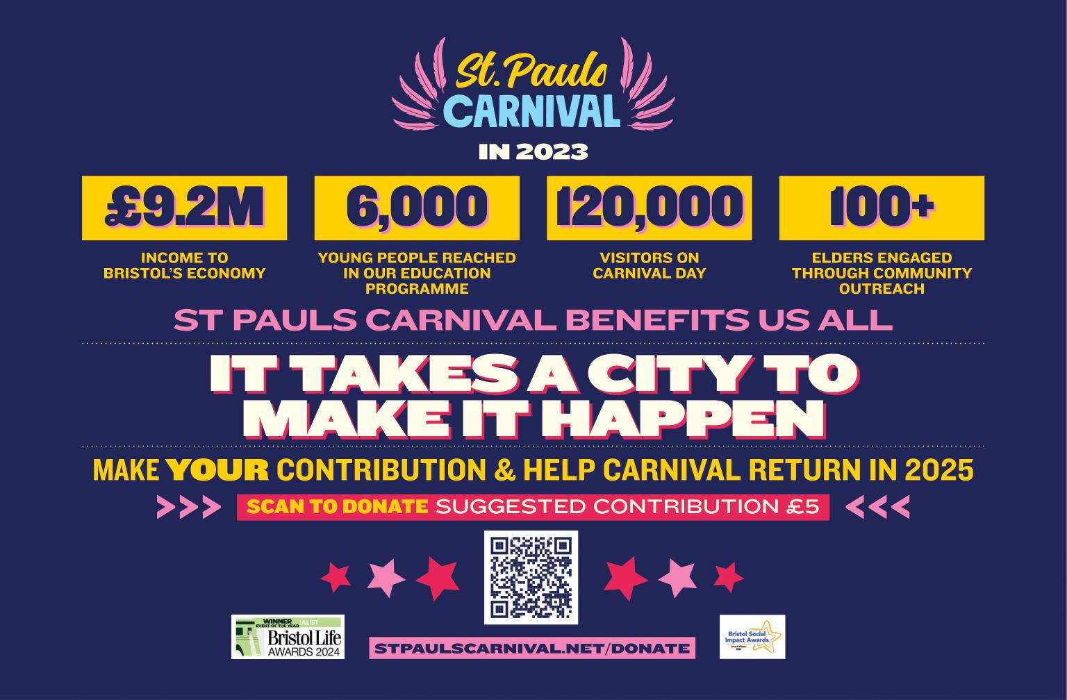 In 2023, St Pauls Carnival brought £9.2M to Bristol’s economy, 120,000 visitors on Carnival Day, engaged 6000 young people in our education programme and over 100 Elders through community outreach. In essence, Carnival benefits us all. But it takes a city to make it happen!