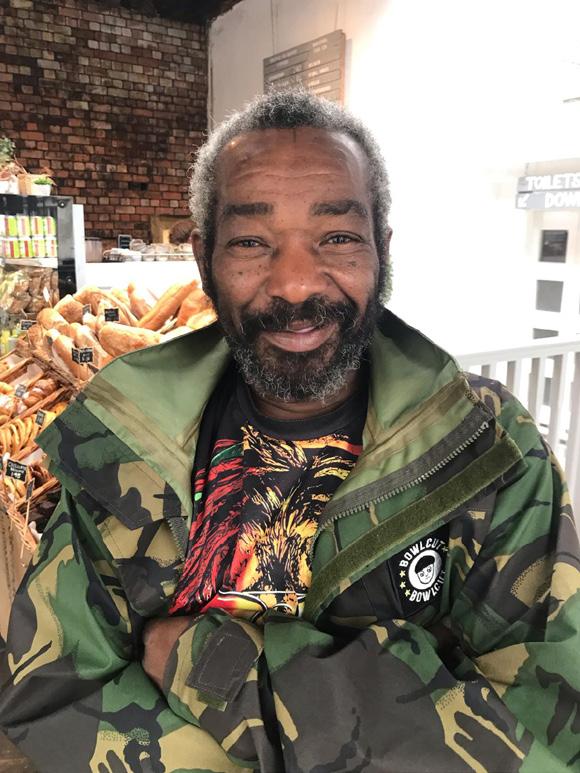 To be found on his patch in Stokes Croft, where he sells the "Big Issue". He is a strong part of the community where he feels a sense of belonging, safety & acceptance. Where he was "muralised" by the prolific and talented Graffiti artist HazardOne. He defiantly brings a smile to lots of faces as he is always up for a hug, a fist bump, or a wave across the street.