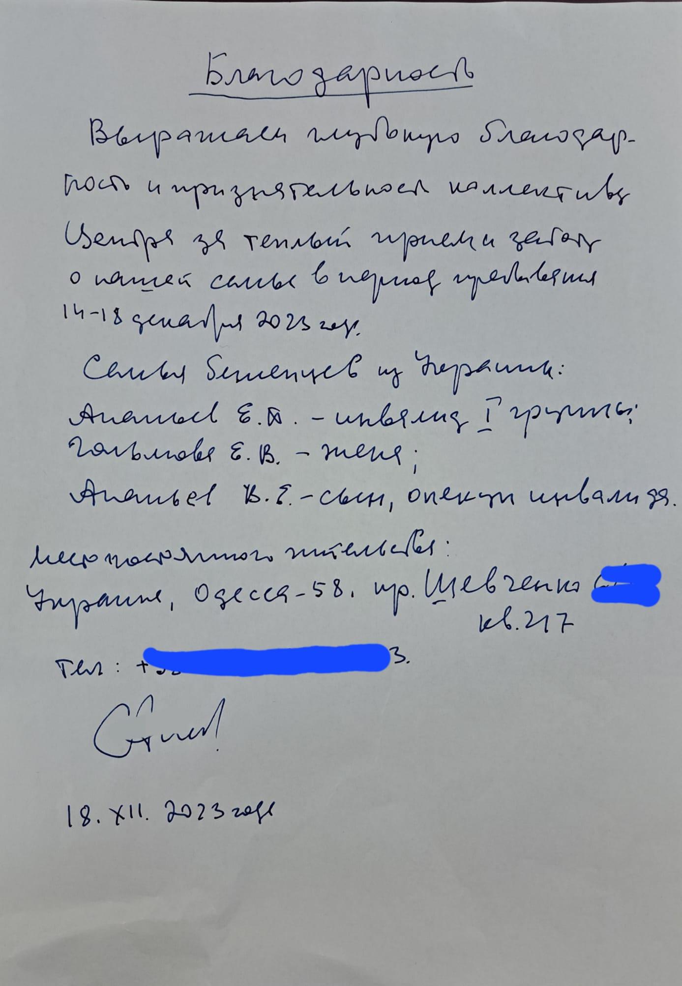 Doresc să-mi exprim multumirea și recunostinta față de colectivul Centrului, pentru primirea calduroasă și grija față de familia noastră, în perioada, în care am locuit în acest Centru: 14-18 decembrie 2023.