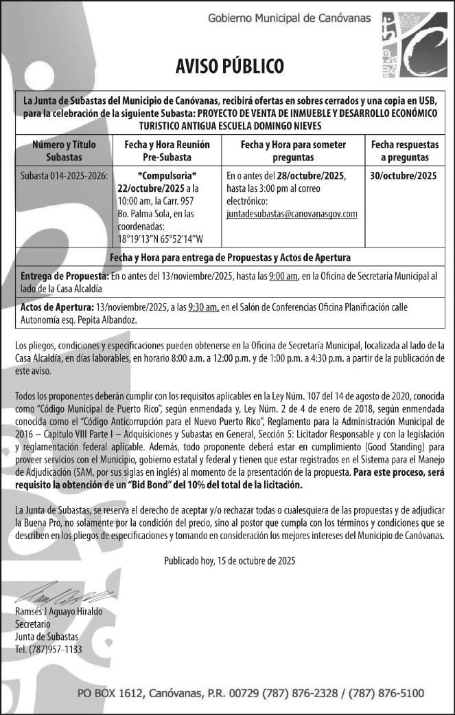 Correo: El Vocero de Puerto Rico, Depto de Edictos, PO Box 15074, San Juan PR 00902