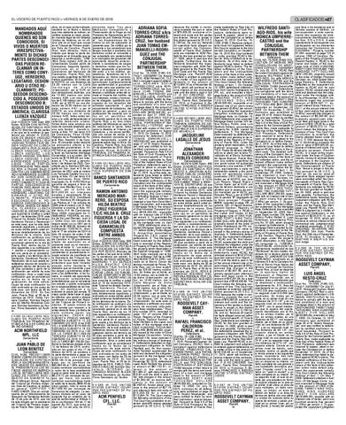 DAS PARTES cia, Sala de Carolina, al público otros gastos, más la suma de e n g e n e r a l : C E R T I F I C O Y $17,550.00 por concepto de DESCONOCIDAS RE- HAGO SABER: Que en cumpli- honorarios de abogado. La senmiento de un Mandamiento de tencia dictada en el caso de CLAMANDO POR, A Ejecución de Sentencia fechado epígrafe fue en rebeldía por lo TRAVES, BAJO O de 15 de julio de 2015, que me que de conformidad al Artículo 3 ha sido>dirigido la secretaría de la Ley ELCONTRA VOCERO DE PUERTO RICO VIERNES, 8 DE ENERO DENúmero 2016 184 de 17 de LOS DE- del Tribunal de por Primera Instan- agosto de 2012, que entró en MANDADOS AQUÍ NOMBRADOS QUIENES NO SON CONOCIDOS, SI VIVOS O MUERTOS IRRESPECTIVAMENTE SI DICHAS PARTES DESCONOCIDAS PUEDEN RECLAMAR UN INTERES COMO CONYUGE, HEREDERO, LEGATARIO, CESIONARIO U OTRO RECLAMANTE; POSEEDOR DESCONOCIDO A, POSEEDOR DESCONOCIDO B; ESTADOS UNIDOS DE AMERICA; CLARISSA LLENZA VAZQUEZ