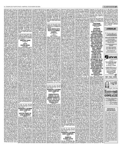 diversity purposes, Plaintiff, mail to defendant. Pursuant to RCAC, is a legal entity organ- Rule 4.6 of the Rule of Civil Proized under the laws of Cayman cedure for the Commonwealth of Islands, having its principal place Puerto Rico, made applicable by of business in the Cayman Is- Rule 4(e) of the Federal Rules of lands. Defendants are citizens of Civil Procedure, defendant was the Commonwealth of Puerto required to serve the answer or Rico. Venue is proper in otherwise plead to the ComRICO > MARTES, 12this DEdisENERO DE 2016 trict pursuant to 28 U.S.C. § plaint on or before October 26, 1391(a), (b), and (c), since all 2015. Because defendant had operative facts alleged herein not appeared before this Court in were committed within the Com- response to the duly served monwealth of Puerto Rico Com- Complaint, on December 14, monwealth of Puerto Rico. De- 2015 this Court entered an orfendants are indebted to RCAC der granting RCACʼs Motion for for the loan granted on Decem- Entry of Default as to defendant ber 31, 2001, which is past due (D.E. 8). As of this date, defendand payable. Furthermore, the ant has failed to defend against Defendants herein breached the RCACʼs claims in the instant repayment obligation with RCAC case. The detailed sufficiency of under the Puerto Rico Civil the Complaint, the undisputable Code, and the Puerto Rico Mort- nature of the facts of this collecgage Law. Plaintiff RCAC is en- tion action, and the affidavit attitled to judgment as a matter of tached to plaintiffʼs Motion Relaw against defendant in the questing Default Judgment (D.E. amount of $462,876.40, as of 9) make default judgment the September 15, 2015, which will appropriate remedy. This Court continue to accrue interest at the makes the following findings of contractual rate. Judgment shall fact: 1. On January 31, 2007, debe entered accordingly. SO fendant obtained a loan from ORDERED, ADJUDGED AND E.M.I. Equity Mortgage, Inc., and DECREED. At San Juan, Pu- executed a Mortgage Note in the erto Rico, on December 30, amount of TWO HUNDRED 2015. S/CARMEN CONSUELO FIFTY NINE THOUSAND TWO CEREZO United States District H U N D R E D DOLLARS Judge ($259,200.00), repayable with an interest rate of six point eight KV-436 ESTADO LIBRE ASO- hundred seventy five percent C IADO DE PUERTO RIC O (6.875%) per annum. 2. As guarTRIBUNAL GENERAL DE JUS- antee of the repayment obligaTICIA TRIBUNAL DE PRIMERA tion evidenced by the Mortgage INSTANCIA SALA MUNICIPAL Note, defendant also executed on January 31, 2007, Mortgage DE FAJARDO Deed number 33 before Notary Public David Cardona-Dingui, Demandante encumbering property number vs. 29,404, which property is owned by defendant. 3. The Mortgage Deed executed by defendant is recorded at the Registry of Property of Puerto Rico, in the SecDemandado CIVIL: NSCI201400824 SOBRE: tion, Registry Book and page, C O B R O D E D I N E R O Y under the property which deEJECUCIÓN DE HIPOTECA scription is: URBAN: HORINOTIFICACIÓN DE SENTEN- ZONTAL PROPERTY: ApartCIA POR EDICTO (Nombre de ment No. 301 on the third floor of las partes a las que se le notific- M A G D A L E N A P A R K C O N an la sentencia por edicto) A: DOMINIUM, located on lot No. *LEFTY RIVERA BORIA POR SI 41 of Boulevard Luchetti corner Y EN REPRESENTACION DE of Ponce de León Avenue of L A S O C I E D A D L E G A L D E Santurce Norte Ward in the City BIENES GANANCIALES COM- of San Juan, Puerto Rico, with a P U E S T A C O N J E N I F E R private superficial area of M A Y S O N E T Q U I Ñ O N E Z , 1,110.00 square feet, equivalent * J E N I F E R M A Y S O N E T to 103.16 square meters. It conQUIÑONEZ POR SI Y EN REP- tains a balcony, dining room, livRESENTACION DE LA SO- ing room, kitchen, two bathCIEDAD LEGAL DE BIENES rooms, two bedrooms, hallways GANANCIALES COMPUESTA and closets. The lineal measureCON LEFTY RIVERA BORIA ments of its main rooms are the BO. DEMAJAGUA, URB. LA following: Balcony: 12ʼ2" by 6ʼ6"; COSTA GARDENS HOME 123 living room: 12ʼ2" by 12ʼ6"; dinCALLE JASMIN B-2, FAJARDO, ing room: 11ʼ10" by 8ʼ4"; kitchen: PR 00738 EL SECRETARIO (A) 8ʼ2" by 8ʼ10"; bathrooms: 7ʼ5" by que suscribe le notifica a usted 4ʼ8", bedrooms: 12ʼ2" by 12ʼ6" que el 16 de septiembre de 2015 and 24ʼ8" by 12ʼ6". The main , este Tribunal ha dictado Sen- door is located on the wall that tencia, Sentencia Parcial o faces the Eastern boundary of Resolución en este caso, que ha the apartment, which is a comsido debidamente registrada y mon general elements of the archivada en autos donde podrá Building. Bounding by the North, usted enterarse detalladamente with the exterior wall of the Conde los términos de la misma. Es- dominium that faces Magdalena ta notificación se publicará una Avenue; by the South, with exsola vez en un periódico de terior wall of the Condominium circulación general en la Isla de that faces the Southern boundPuerto Rico, dentro de los (10) ary of the lot; by the East, with días siguientes a su notificación. apartment No. 302, hallways, elY, siendo o representado usted evator and stairways; and by the una parte en el procedimiento West, with the exterior wall of sujeta a los términos de la Sen- the Condominium that faces the tencia, Sentencia Parcial o Eastern boundary of the lot. To Resolución, de la cual puede es- this apartment corresponds in tablecerse recurso de revisión o the general common elements of apelación dentro del término de the Condominium a participation 30 días contados a partir de la of 5.26%. Property number publicación por edicto de esta 29404, recorded at page 31 of notificación, dirijo a usted esta volume 1141 of North Santurce, notificación que se considerará Registry of the Property of San h e c h a e n l a f e c h a d e l a Juan, First Section. 4. RCAC is publicación de este edicto. the owner and holder of the Copia de esta notificación ha mortgage note of TWO HUNsido archivada en los autos de DRED FIFTY NINE THOUeste caso, con fecha de 4 