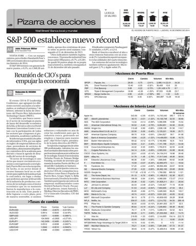 dades, apenas dos centésimas de punto sobre su previo nivel máximo, conseguido el 31 de diciembre de 2013. Otros indicadores también registraron avance. El promedio industrial Dow Jones subió 108 puntos, o 0,7%, a 16.481. Se quedó 94 puntos abajo de su propia marca histórica, también conseguida el 31 de diciembre del año pasado.