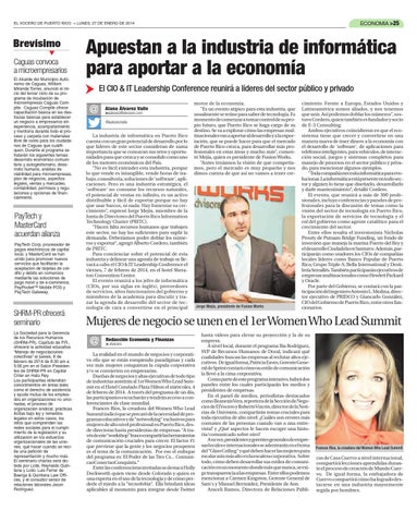 cimiento. Frente a Europa, Estados Unidos y Latinoamérica somos aliados, y nos tenemos que unir. Así podemos doblar los números”, sostuvo Cordero, quien también es fundador y socio de E-3 Consulting. Ambos ejecutivos coincidieron en que el ecosistema tiene que crecer y convertirse en una manera nueva de traer dinero a la economía con el desarrollo de 'software', de aplicaciones para teléfonos inteligentes, para vehículos, de interacción social, juegos y sistemas completos para manejo de procesos en el sector público y privado, para mencionar algunos ejemplos. “Toda compañía necesita informática para evolucionar. La informática está presente en todo sector y alguien lo tiene que diseñarlo, desarrollarlo y darle mantenimiento”, detalló Cordero. El evento, que reunirá a más de 300 profesionales, incluye conferencias y paneles de profesionales para la discusión de temas como la visión del sector de tecnología en Puerto Rico, la exportación de servicios de tecnología y el rol del gobierno como agente catalítico para el crecimiento del sector. Entre ellos resalta el inversionista Nicholas Prouty de Putnam Bridge Funding, un fondo de inversión que maneja la marina Puerto del Rey y el desarrollo Ciudadela en Santurce. Además, participarán como oradores los CIOs de compañías locales líderes como Banco Popular de Puerto Rico, Grupo Triple-S, Bella International y Destilería Serrallés. También participarán ejecutivos de empresas multinacionales como Hewlett Packard y Oracle. Por parte del Gobierno, se contará con la participación del ingeniero Antonio L. Medina, director ejecutivo de PRIDCO y Giancarlo González, CIO del Gobierno de Puerto Rico, entre otros funcionarios.