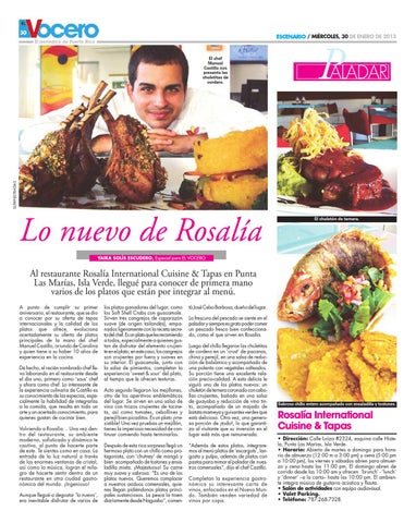 tó José Celso Barbosa, dueño del lugar. La frescura del pescado se siente en el paladar y siempre es grato poder comer un pescado fresco bien confeccionado, como el que sirven en Rosalía. Luego del chillo llegaron las chuletitas de cordero en un ‘crust’ de pacanas, china y perejil, en una salsa de reducción de balsámico y acompañado de una polenta con vegetales salteados. Su porción tiene una excelente relación precio-calidad. A esta delicia le siguió uno de los platos nuevos: un chuletón de ternera coronado con cebollas crujientes, bañado en una salsa de guayaba y reducción de vino tinto, acompañado de un majado de batata mameya y guisantes verdes que está delicioso. Otra vez, una generosa porción de ¡todo!, lo que garantiza al visitante que su inversión en el lugar está más que remunerada. “Además de estos platos, integraremos al menú platos de ‘escargots’, langosta y pulpo, además de platos con pastas para mimar el paladar de nuestros comensales”, dijo el chef Castillo. Completan la experiencia gastronómica su interesante carta de vinos, enfocados en el Nuevo Mundo. También venden variedad de vinos por copa.