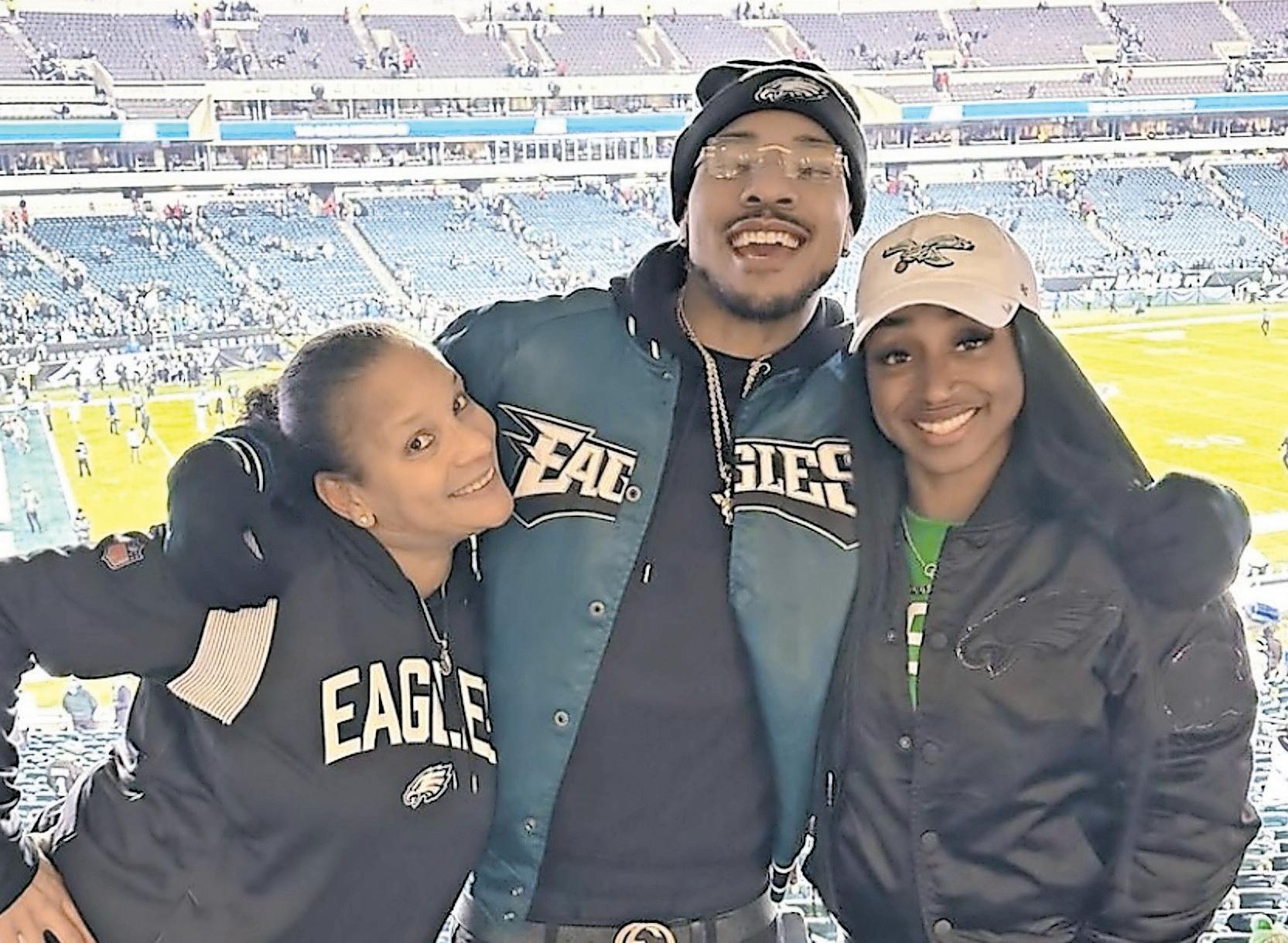 Jasmine Camacho-Quinn (der.) posa junto a uno de sus hermanos y su madre María en un juego de esta temporada de los Eagles en la NFL.