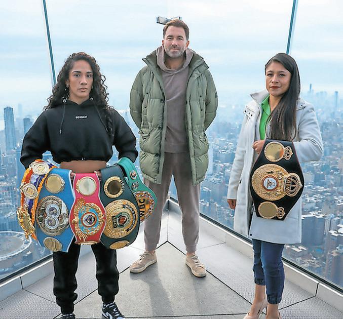 Amanda Serrano (izq.) posa junto al promotor Eddie Hearn y la mexicana Erika Cruz durante el encuentro de ayer. > Suministrada
