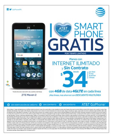Oferta de Maven 2: Equipo restringido para uso en GoPhone durante los primeros 6 meses. No se puede utilizar en otras compañías de servicio móvil. Requiere línea nueva de servicio GoPhone en plan de $45 mensual o más y suscribir la cuenta a Pago Automático (Auto Recarga). Precio regular es $40. Requiere compra del primer mes de servicio en la misma transacción de la compra del equipo. Pagos de impuestos por equipo y pago del plan de servicio es adicional al pago del teléfono. Aplica cargo de restitución de $45 a cada teléfono si es devuelto en 14 días. Tarifa de $34 por línea por mes: considera cuenta con 5 líneas en plan de Descuento Multilínea con tarifa de $45 mensual. Descuentos mensuales en las líneas son: $5 por auto-recarga en la 1ra línea, $5 en la 2da, $10 en la 3ra, $15 en la 4ta y $20 en la quinta. El titular de la cuenta es el responsable de pagar los cargos mensuales del plan para todas las líneas. Las líneas de los demás usuarios no reúnen los requiitos para el descuento por Pago Automático. Términos y restricciones adicionales aplican. Detalles en: att.com/gomulti. Crédito de $5 mensual por Auto Recarga: requiere suscribirse a pago automático con Auto Recarga en una tienda, kiosco AT&T o en att.com/goautorefill. El pago automático (Auto Recarga) debe ser igual o mayor a la cantidad del plan mensual y la fecha del mismo debe ser establecida a un día previo a la fecha de vencimiento del plan mensual y se debe utilizar una tarjeta de crédito o débito. Aplica a clientes con servicio GoPhone en planes de $45 mensual o más. El crédito de $5 se reflejará en la cuenta de la tarjeta de crédito o débito que utiliza para la recarga automática en aproximadamente 30 días luego de la Auto Recarga. El programa puede no ser combinable con otras ofertas GoPhone ni descuentos a tarifas. Detalles en: att.com/autorefill. Planes ilimitados GoPhone incluyen llamadas, mensajes y data ilimitada. Cada tarifa tiene una cantidad de data de alta velocidad, tras haberse agotado la asignación de data de alta velocidad, las velocidades de data disminuyen a una velocidad máxima de 128 kbps durante el resto del plazo de 30 días. Las velocidades reales varían según el equipo y la ubicación. Generalidades: Al activar o usar el servicio de GoPhone, aceptas cumplir con los Términos del Servicio y del Plan que se encuentran en att.com/gophone. Se debe agregar dinero a la cuenta dentro de los 26 días posteriores a la activación; de lo contrario, se cancelará la cuenta. Planes Mensuales: Los servicios y funciones se ofrecen durante 30 días después del pago del cargo del plan de tarifas. Los planes mensuales vencen a las 11:59 p. m. (hora central) del día 30. Servicio de Voz: Los minutos son solo para uso en Puerto Rico, EE.UU. e Islas Vírgenes de EE.UU. Es posible que las llamadas a servicios “premium” o servicios especiales estén bloqueadas. Los servicios no se pueden revender ni usar con fines fraudulentos. Existen otros términos, condiciones y restricciones geográficas y de uso. Precios están sujetos a cambio. Otros cargos mensuales por línea: Un cargo de recobro de costos reglamentarios de hasta $1.25, un cargo variable por contribución sobre propiedad inmueble estatal de hasta $1.00 y cargos por Servicio Universal federal y estatal. Estos cargos no son impuestos o cargos requeridos por el gobierno. Impuestos sobre Ventas, uso y otros cargos aplican. Para más información: visita att.com/gophone. Servicio ofrecido por AT&T Mobility. © 2017 AT&T Intellectual Property. Todos los derechos reservados. Ofertas válidas del 9 al 14 de febrero de 2017.