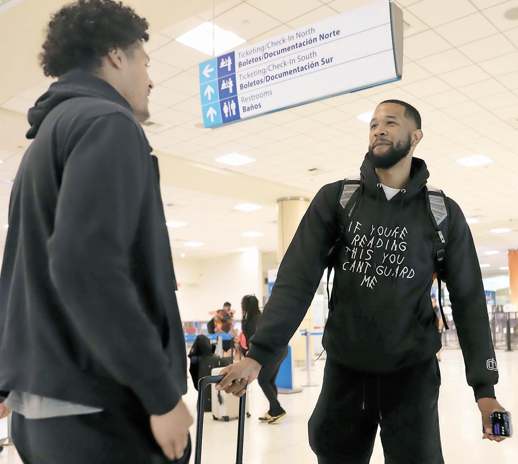 Chris Ortiz (al centro) conversa con Jordan Cintrón a su llegada ayer al aeropuerto en Isla Verde. > Giovanny Vega / EL VOCERO