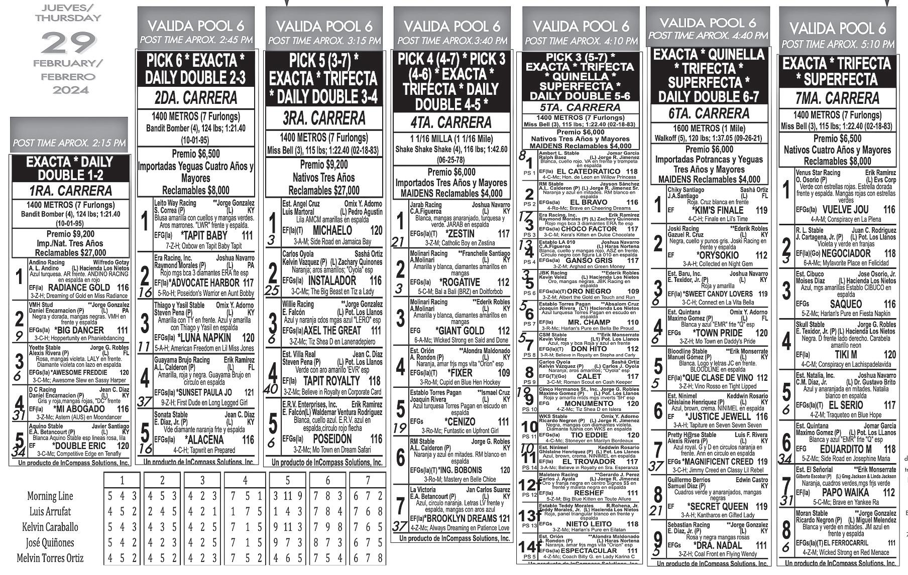 Si arranca, tendrá la mejor oportunidad, así que no lo deje fuera. Lo acompañamos con Choco Factor, que luce por su consistencia y con El Trovador, que es nuestra posible sorpresa. La superfecta la completamos con Tío Eddie. En la sexta carrera recomendamos a Magnificent Creed, que baja mucho de reclamo y Secret Queen, que viene de buena labor. La superfecta se completa con Sweet Candy Lovers y Town Pride. Del resto, mucho ojo con Que Clase De Vino. Para la séptima nos gustan Eduardito M. y Negociador. La superfecta la completamos con Papo Waika y El Ferrocarril.