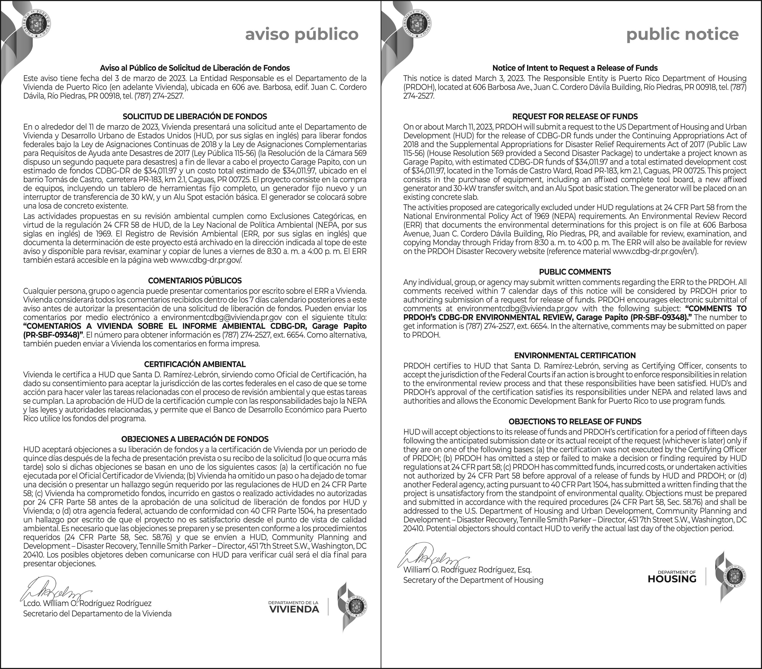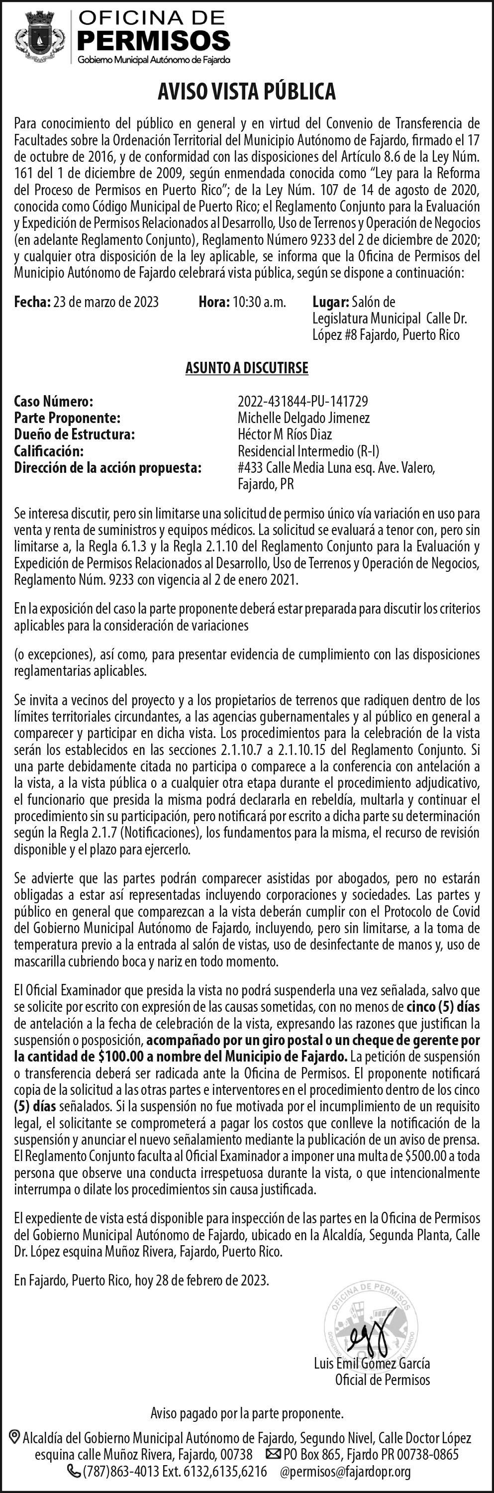 a r c i a l o Reso ución en este caso, que ha s i d o d e b i d a m e n t e r e g i s t r a d a y arch vada en autos donde podrá usted enterarse deta ladamente de los térm nos de a misma Esta notificac ón se publicará una s o l a v e z e n u n p e r ó d i c o d e c rculación genera en la Isla de P u e r t o R i c o , d e n t r o d e l o s 1 0 días s guientes a su not f cación Y s e n d o o r e p r e s e n t a n d o u st e d u n a p a r t e e n e l p r o c e d m iento su eta a los términos de a S e n t e n c i a , S e n t e n c i a P a r c i a o Resolución, de la cual puede estab ecerse recurso de revis ón o ape ac ón dentro del término de 3 0 d í a s c o n t a d o s a p a r t r d e a p u b l i c a c ó n p o r e d c t o d e e s t a n o t i f i c a c i ó n , d i r j o a u s t e d e s t a not f cación que se considerará h e c h a e n l a f e c h a d e l a p u b l c a c ó n d e e s t e e d i c t o C o p a d e e s t a n o t i f i c a c i ó n h a s d o a r c h v a d a e n l o s a u t o s d e e s t e c a s o , c o n f e c h a d e 2 8 d e febrero de 2023 En SAN JUAN Puerto Rico el 28 de febrero de 2023 GRISELDA RODRIGUEZ C O L L A D O N o m b r e S e c r e t a r i o ( a ) F / M I L D R E D J FRANCO REVEN TOS Nombre Secretar o(a) Auxil ar Firma Secretario(a) Auxil ar
