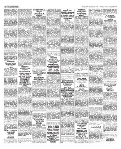 KV-3622 ESTADO LIBRE ASOCIADO DE PUERTO RICO Demandados TRIBUNAL GENERAL DE JUS- CIVIL NÚM.: D2CP2016-0031 S TICIA TRIBUNAL PRIMERA DE o bPUERTO r e : CANCELACIÓN DE ELDE VOCERO RICO > MARTES, 7 DE MARZO DE 2017 INSTANCIA SALA DE BAYA- PAGARÉ EXTRAVIADO EMMON PLAZAMIENTO POR EDICTO E S T A D O S U N I D O S D E MR-1192 ESTADO LIBRE ASOAMÉRICA EL PRESIDENTE DE CIADO DE PUERTO RICO TRILOS E.E.U.U. EL ESTADO BUNAL GENERAL DE JUSTILIBRE ASOCIADO DE PU- CIA TRIBUNAL DE PRIMERA VS ERTO RICO } S.S. A : FULANO INSTANCIA SALA DE SAN DE TAL Y MENGANO DE CU- JUAN AL o sea, las personas ignoradas que puedan ser tenedores CASO: D CD2015-1946 SALON: de los pagarés extraviados POR 0 4 0 2 S O B R E : C O B R O D E MEDIO del presente edicto se le VS DINERO EJECUCION DE HI- notifica de la presentación de POTECA WENDELL REYES una Demanda contra usted por C O S M E , Y A J A I R A V E G A la parte demandante en la que GODEN Y LA SOCIEDAD LEG- ésta alega que por escritura AL DE GANANCIALES POR EL- Número 249, otorgada en San CASO: K CD2016-1512 SALON: LOS COMPUESTA NOTIFICA- Juan, Puerto Rico, el 19 de abril 0 8 0 7 S O B R E : C O B R O D E CION DE SENTENCIA POR de 1972, ante el Notario Mari- DINERO EJECUCION DE HIEDICTO EL SECRETARIO(A) ano Acevedo Defilló el entonces POTECA ACOSTA ADJUSTQUE SUSCRIBE LE NOTIFICA titular de la propiedad más ad- MENT, INC.; ZAIDA REBECA A U S T E D Q U E E L 1 3 D E elante descrita, reconoció haber RODRIGUEZ ACOSTA, EMILIO E N E R O D E 2 0 1 7 , E S T E r e c i b i d o l a c a n t i d a d d e RAMIREZ ZAVALA Y LA SOTRIBUNAL HA DICTADO SEN- $ 3 8 , 0 0 0 . 0 0 e n c a l i d a d d e CIEDAD LEGAL DE BIENES TENCIA, SENTENCIA PAR- préstamo; y en garantía de di- GANANCIALES COMPUESTA C I A L O R E S O L U C I O N E N cho préstamo se constituyó hi- POR AMBOS. NOTIFICACION ESTE CASO, QUE HA SIDO poteca a favor de First Federal DE SENTENCIA POR EDICTO DEBIDAMENTE REGISTRADA Savings & Loan Association of E L S E C R E T A R I O ( A ) Q U E Y ARCHIVADA EN AUTOS Puerto Rico; y por escritura Nu- SUSCRIBE LE NOTIFICA A USDONDE PODRA USTED EN- mero 317, otorgada en San TED QUE EL 28 DE FEBRERO TERARSE DETALLADAMENTE Juan, Puerto Rico, el 21 de DE 2017 , ESTE TRIBUNAL HA DE LOS TERMINOS DE LA mayo de 1999, ante el Notario DICTADO SENTENCIA, SENMISMA, ESTA NOTIFICACION Heberto J. De Vizcarrondo Arm- TENCIA PARCIAL O RESOLUSE PUBLICARA UNA SOLA strong el entonces titular de la CION EN ESTE CASO, QUE HA VEZ EN UN PERIODICO DE propiedad más adelante descrita SIDO DEBIDAMENTE REGISCIRCULACION GENERAL EN reconoció haber recibido la can- TRADA Y ARCHIVADA E N LA ISLA DE PUERTO RICO, tidad de $20,000.oo en calidad AUTOS DONDE PODRÁ USDENTRO DE LOS 10 DIAS de préstamo; y en garantía de TED ENTERARSE DETALLASIGUIENTES A SU NOTIFICA- dicho préstamos se constituyó DAMENTE DE LOS TERMICION. Y, SIENDO O REPRES- hipoteca a favor de R&G Mort- NOS DE LA MISMA. ESTA NOENTANDO USTED UNA PARTE gage Corporation sobre la finca TIFICACION SE PUBLICARA E N E L P R O C E D I M I E N T O que se describe a continuación: UNA SOLA VEZ EN UN PERISUJETA A LOS TERMINOS DE ---“URBANA: Solar número 8 del O D I C O D E C I R C U L A C I O N LA SENTENCIA, SENTENCIA B l o q u e “J” de l a GENERAL, EN LA ISLA DE PUPARCIAL O RESOLUCION, DE URBANIZACIÓN LOS FRAILES ERTO RICO, DENTRO DE LOS LA CUAL PUEDE ESTABLE- del Barrio de Guaynabo, Puerto 10 DIAS SIGUIENTES A SU CERSE RECURSO DE REVI- Rico, con una cabida superficial NOTIFICACION. Y, SIENDO O SION O APELACION DENTRO d e c u a t r o c i e n t o s REPRESENTANDO USTE D DEL TERMINO DE 30 DIAS cincuenta(450.00) metros cuad- UNA PARTE EN EL PROCEDICONTADOS A PARTIR DE LA rados. En lindes por el NORTE, MIENTO SUJETA A LOS TERPUBLICACION POR EDICTO en quince metros con cuatro- MINOS DE LA SENTENCIA, DE ESTA NOTIFICACION, DIR- cientos setenta y tres (15.473) SENTENCIA PARCIAL O RESIJO A USTED ESTA NOTIFICA- milímetros con Calle numero 1; O L U C I O N , D E L A C U A L CION QUE SE CONSIDERARA por el SUR, en quince metros PUEDE ESTABLECERSE REHECHA EN LA FECHA DE LA con setenta y tres (15.73) C U R S O D E R E V I S I O N O P U B L I C A C I O N D E E S T E centímetros con terrenos de Los APELACION DENTRO DEL DICTO. COPIA DE ESTA NO- Frailes, Inc.; por el ESTE, en TERMINO DE 30 DIAS CONTATIFICACION HA SIDO ARCHIV- veintinueve metros ochenta y DOS A PARTIR DE LA PUBLICADA EN LOS AUTOS DE ESTE tres (29.83)centímetros con el ACION POR EDICTO DE ESTA CASO, CON FECHA DE 01 DE solar número 9 del Bloque “J”; y NOTIFICACICN, DIRIJO A USMARZO DE 2017 LIC. COLÓN por el OESTE, en veintinueve TED ESTA NOTIFICACION P É R E Z M Á D E L I N metros con ochenta y tres Q U E S E C O N S I D E R A R A MCOLON@COLONROMAN.CO (29.83) centímetros con el Solar HECHA EN LA FECHA DE LA M EN BAYAMON, PUERTO del Bloque “J”. Contiene una P U B L I C A C I O N D E E S T E RICO, A 01 DE MARZO DE casa de concreto dedicada a DICTO. COPIA DE ESTA NO2017. POR: RUTH APONTE vivienda.---------------------------- --- TIFICACION HA SIDO ARCHIVC O T T O S E C R E T A R I O FINCA número 18260 inscrita al ADA EN LOS AUTOS DE ESTE NEREIDA QUILES SANTANA folio 90 tomo 375, Registro de la CASO, CON FECHA DE 02 DE NOMBRE Y FIRMA SECRET- Propiedad de Guaynabo.---------- MARZO DE 2017 LIC. JULIA ARIO AUXILIAR JEAN PAUL -------- Las obligaciones repres- D I A Z e n t a d a s p o r l o s r e f e r i d o s JPJULIA@RMMELAW.COM EN SAN JUAN, PUERTO RICO, A pagarés fueron pagadas totalKV-3628 ESTADO LIBRE ASO02 DE MARZO DE 2017. CIADO DE PUERTO RIC O mente. Los descritos pagarés se GRISELDA RODRIGUEZ COLTRIBUNAL DE PRIMERA INS- han extraviado sin que la parte L A D O S E C R E T A R I O P O R : TANCIA SALA SUPERIOR DE demandante los haya podido MICHELLE AQUINO CRU Z localizar a pesar de las gesCOAMO tiones realizadas, por lo cual no NOMBRE Y FIRMA SECRETlos tiene para la cancelación cor- ARIO AUXILIAR respondiente en el Registro de la Propiedad y por ello comCalle Barbosa#67 Coamo, P.R. p a