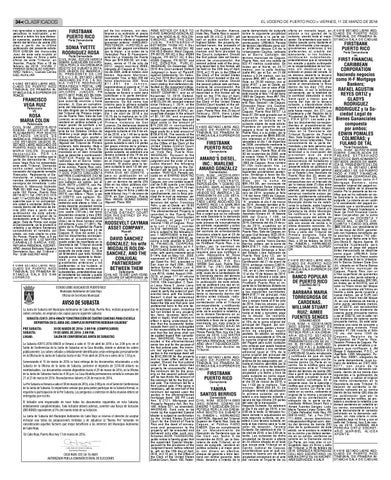 Parte Demandada CIVIL NÚM. E2CI201400514 SOBRE: EJECUCIÓN DE HIPOTECA POR LA VÍA ORDINARIA EDICTO DE SUBASTA ESTADOS UNIDOS DE AMERICA } EL PRESIDENTE DE LOS E.E.U.U. } EL ESTADO LIBRE ASOCIADO DE P.R. } A: SOKV-842 ESTADO LIBRE ASO- N I A Y V E T T E R O D R I G U E Z C IADO DE PUERTO RIC O ROSA FISICA Y POSTAL: URB. TRIBUNAL DE PRIMERA IN- MIRAFLORES, 14 CALLE MIRSTANCIA SALA SUPERIOR DE A F L O R E S , J U N C O S , P R 00777-3612 PUBLICO EN GENPONCE ERAL El Alguacil del Tribunal que suscribe anuncia y hace constar: A. Que en cumplimiento del Mandamiento que me Peticionario ha sido dirigido por la Secretaria VS. del Tribunal de Primera Instancia de Puerto Rico, Sala de San Lorenzo, en el caso de epígrafe, venderé en pública subasta y al Peticionada mejor postor de contado y en CIVIL NUM. JEQ2015-0010 moneda de curso legal y corriSOBRE: EXECUATUR EM- ente de los Estados Unidos de PLAZAMIENTO POR EDICTO América y cuyo pago se efectuE S T A D O S U N I D O S D E rá en efectivo, giro postal o AMÉRICA EL PRESIDENTE DE cheque certificado a nombre del LOS ESTADOS UNIDOS EL Alguacil del Tribunal de Primera ESTADO LIBRE ASOCIADO DE Instancia, todo derecho, título o PUERTO RICO) SS A: ROSA interés que tenga la Parte DeM A R I A C O L O N . D i r e c c i ó n mandada en el bien inmueble d e s c o n o c i d a . P O R L A que se describe a continuación: PRESENTE se le notifica que la RUSTICA: Predio de terreno parte de demandante, Fran- radicado en el Barrio Valencisco Vega Ruiz ha presentado ciano Abajo del término municipante este Tribunal, Demanda al de Juncos, Puerto Rico, comcontra usted, solicitando la puesto de CIENTO CUARENTA concesión del siguiente remedio: Y DOS PUNTO CINCUENTA Execuatur. Representa al Demandante, el abogado cuyo METROS CUADRADOS (142.50 nombre, dirección y teléfono se m.c.). En lindes por el NORTE, consigna de inmediato: Lcdo. con callejón sin salida; por el Marcos E. Marcucci Sobrado SUR, ESTE y OESTE, con RaPMB 351 609 Ave. Tito Castro, fael Flores antes, hoy por el suite 102 Ponce, Puerto Rico SUR, con Ángel Algarín; por el 00716-0211 Tel. (787) 812-1313 ESTE, con Maria I. Rijos; y por lcd0.111arCOSUMI.COM Se le el OESTE, con callejón. Enapercibe que si no compareci- clava una casa. Por su proere usted a contestar dicha De- cedencia está afecta a: libre. La manda dentro del término de tre- antes descrita propiedad consta inta (30) días a partir de la inscrita al folio ciento noventa y K V - 8 6 0 I N T H E U N I T E D publicación de este edicto, uno vuelto (191vto.) del tomo STATES DISTRICT COURT presentando el original de la doscientos noventa y tres (293) FOR THE DISTRICT OF PUcontestación ante el Tribunal Su- de Juncos, inscripción segunda ERTO RICO perior, Sala de Ponce, con copia (2da.) de la finca número once al Demandante, se le anotará la mil ochenta y uno (11,081), Rerebeldía y se dictará Sentencia gistro de la Propiedad de Puerto concediendo el remedio sol Rico, Sección Segunda (II) de Plaintiff, citado, sin más citarle no oírle. Caguas. B. Que los autos y tovs. En Ponce, Puerto Rico, a 8 de dos los documentos corresponfebrero de 2016. LUZ MAYRA dientes al procedimiento inCARABALLO GARCIA, SEC- coado están de manifiesto en la RETARIA REGIONAL SECRET- Secretaría del Tribunal durante ARIO Jessica Barlucea Figueroa las horas laborables bajo el Secretaria Aux. del Tribunal I epígrafe de este caso. C. Que se entenderá que todo licitador Por: SUB-SECRETARIO acepta como bastante la titularidad y que las cargas y gravámenes anteriores y los KV-859 ESTADO LIBRE ASO- preferentes, si los hubiere, al C IADO DE PUERTO RIC O crédito ejecutante, continuarán TRIBUNAL DE PRIMERA IN- subsistentes, entendiéndose que Defendants S T A N C I A S A L A D E S A N el rematente los acepta y queda CIVIL NO. 15-2357 (JAF) FORELORENZO subrogado en la responsabilid- CLOSURE OF MORTGAGE (IN ad de los mismos, sin des- REM) NOTICE OF SALE TO: tinarse a su extinción el precio DAVID SANCHEZ-GONZALEZ; del remate. D. Que laDEPropiedad ESTADO LIBRE ASOCIADO PUERTO RICOhis wife MIGDALIS ROLONse encuentra afecta al siguiente SANCHEZ, AND THE CONParte Demandante Municipio Autónomo de Cabo Rojo J U G A L P A R T N E R S H I P gravamen anterior: -NINGUNOVs. Oficina de Secretaría Municipalen BETWEEN THEM HC 4 Box POSTERIOR: -HIPOTECA: garantía del pagaré constituida 45395 Caguas, PR 007251 RD por la titular, a la orden de la KM 45.5 Beatriz Ward Caguas, Autoridad Para El Financiami- PR 00725 RR HC 4 Box 45395 Parte Demandada ento De La Vivienda De Puerto Caguas, PR 00727 HC 4 Box CIVIL NÚM. La JuntaE2CI201400514 de Subasta del Municipio Autónomo de Cabo Rojo, Puerto 45395 Rico, recibirá propuestas en and Caguas, PR 00707 SOBRE: EJECUCIÓN DE HIPO- Rico por $15,000.00, sin inter- T H E G E N E R A L P U B L I C ; sobres cerrados, en original y dos copias para laelsiguiente subasta: eses, vence 13 de julio de TECA POR LA VÍA ORDINARIA WHEREAS: On December 16th, según escritura #388, EDICTO DE SUBASTA ESTA- 2012, SUBASTA #2015-2016-006CR “CONSTRUCCIÓN DE CUATRO CANCHAS PARA ESCUELA 2015 this Court entered Default DOS UNIDOS DE AMERICA } otorgada en Caguas el 13 de ju- Judgment in favor of Plaintiff, nio de 2004, ante el DEPORTIVO notario JuanREBEKAH COLBERG” DEL COMPLEJO E L P R E S I D EDEPORTIVA N T E D E EN L OEL S ÁREA against Defendants. On FebruE.E.U.U. } EL ESTADO LIBRE M a t o s A c e v e d o M a r t i n e z , ary 2nd, 2016 this Court entered inscripción folioP.M. 205(COMPULSORIO) del PRE SUBASTA: 30 DE MARZO DE7ma. 2016-al2:00 ASOCIADO DE P.R. } A: SOan Order for Execution of Judg359, finca tomo electrónico N I A Y SUBASTA: V E T T E R O D R I G U E19 Z DE ABRIL DE 2016- 2:00 P.M. # 1 1 , 0 8 1 d e J u n c o s ; ment stating that defendant deROSA FISICA LUGAR: Y POSTAL: URB. SALÓN DE CONFERENCIAS JUNTA DE SUBASTAS faulted on the repayment obligaMIRAFLORES, 14 CALLE MIR- registrándose el asiento el 17 de tion to ROOSEVELT CAYMAN A F L 