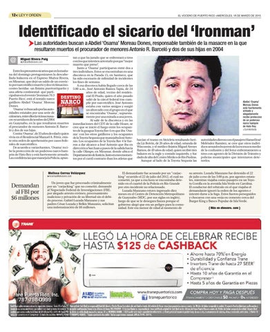 Identificado el sicario del ‘Ironman’ Las autoridades buscan a Abdiel ‘Osama’ Moreau Dones, responsable también de la masacre en la que resultaron muertos el procurador de menores Antonio R. Barceló y dos de sus hijas en 2004 tan a que ha jurado que se enfrentará a tiros con los que intenten arrestarlo porque “mejor muerto que preso”. Junto a 'Osama' participaron entre dos a Entre los presuntos sicarios que en la maña- tres individuos. Estos se encontraban en una na del domingo protagonizaron la descabe- discoteca en la Parada 15, en Santurce, que llada balacera en el Expreso Muñoz Rivera, ha sido escenario de infinidad de incidentes en Miramar, que dejó un saldo de un convic- los fines de semana. to por narcotráfico muerto y dos víctimas inoA esa discoteca había llegado cerca de las centes heridas -un fisiatra puertorriqueño y 5:00 a.m., José Antonio Ramos Tapia, de 24 una atleta continental- que partiaños de edad, vecino del residencipaban en el evento ‘Ironman 70.3 El Prado, quien el año pasado DESTINO cial Puerto Rico’, está el temido narco salió de la cárcel federal tras cumgatillero Abdiel 'Osama' Moreau plir por narcotráfico. José Antonio Dones. estaba con varios amigos y surgió 'Osama' es buscado por las autoun altercado con el grupo en el que ridades estatales por una serie de se encontraba 'Osama', supuestacrímenes, entre ellos la viciosa masamente por una mirada a una joven. cre ocurrida en diciembre del 2004 Al salir de la discoteca y en las en Guaynabo, en la que resultaron muertos inmediaciones del CDT de la calle Hoare, se el procurador de menores Antonio R. Barce- cree que se inició el fuego entre los ocupanló y dos de sus hijas. tes de la guagua Toyota Rav 4 en que iba 'OsaContra 'Osama', de 33 años de edad y quien ma' con los otros gatilleros y los ocupantes vivía en el Residencial Manuel A. Pérez, exis- de la Toyota Sequoia que manejaba José Antote otra orden de aprehensión por casos fede- nio. Los ocupantes de la Toyota Rav 4 le fuerales de narcotráfico. ron a dar alcance a José Antonio que iba en De acuerdo a varias fuentes, 'Osama' reci- dirección a San Juan a pasos de la salida hacia be la protección de un poderoso narco ham- la calle Olimpo, en Miramar, donde ubica el pón de Hato Rey y está fuertemente armado. Departamento de Justicia. Justo en esos momenLas confidencias que maneja la Policía, apun- tos por el carril contrario iban los atletas que
