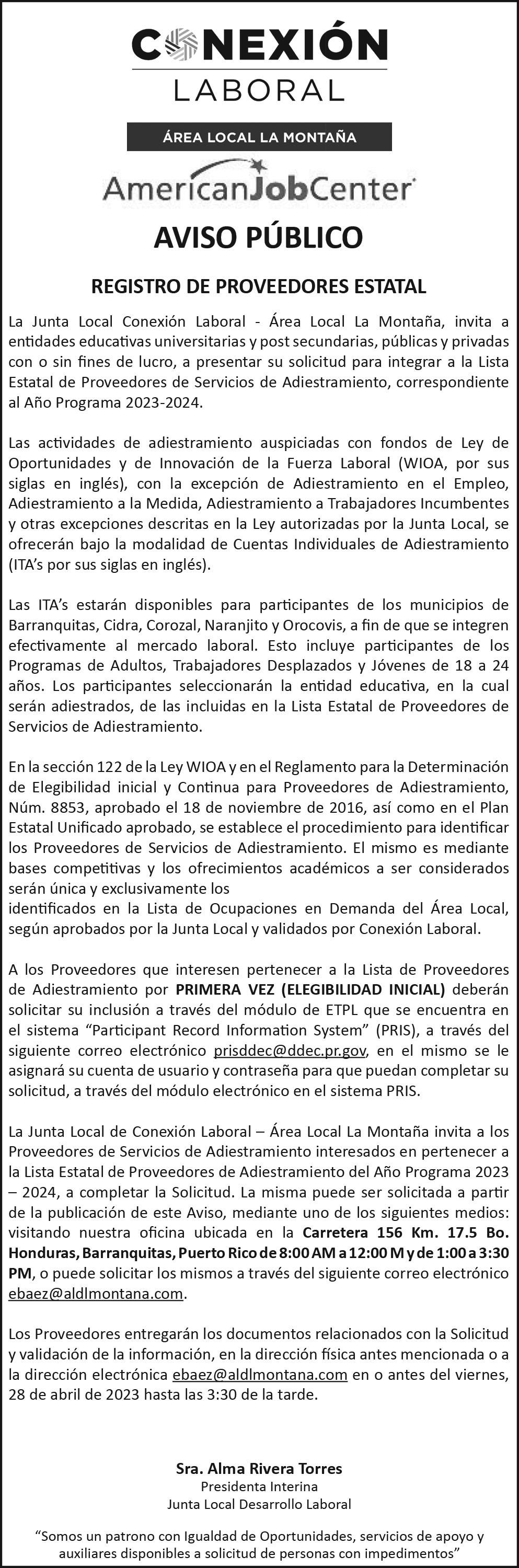 RUSTICA: en e barrio C énaga B a j a d e t é r m i n o m u n i c i p a l d e R o G r a n d e P u e r t o R c o c o n una cabida superf c al de qu ne n t o s m e t r o s e n l i n d e s p o r e l Norte con camino vecinal, por el Sur con Juana Rodríguez, por el Este con cam no vecina y por el O e s t e c o n R e g n o Q u ñ o n e s E n c l a v a c a s a d e c e m e n t o d e dos n ve es La prop edad menc i o n a d a s e e n c u e n t r a u b c a d a e n B a r r i o M a l p i c a s e c t o r E l Hoyo, Carretera 958 Km 1 0 nt e r o r R i o G r a n d e P R 0 0 7 4 5 Debe presentar el origina de su e s c r i t o a l T r i b u n a y n o t i f c a r c o p i a d e l m s m o a r e p r e s e n ta n t e e g a d e l a p a r t e p r omovente María M Febus Orti z c u y a d r e c c i ó n e s : P O B o x 192513 San Juan P R 00919 y c u y o t e l é f o n o e s e l ( 7 8 7 ) 4 4 49 8 7 9 E s t e e d c t o d e b e r á s e r publicado en tres (3) ocasiones dentro del térm no de veinte (20) d í a s e n u n p e r i ó d i c o d e c i r c u l a c i ó n g e n e r a d a r a p a r a q u e c o m p a r e z c a n s i q u i e r e n alegar su derecho Toda primera mención de persona natural y/o j u r í d c a q u e s e m e n c i o n e e n el m s m o s e d e n t i f c a r a e n l e t r a t a m a ñ o 1 0 p u n t o s y n e g r i l l a s , c o n f o r m e a l o d s p u e s t o e n l as R e g a s d e P r o c e d i m e n t o C i v i l , 2009 Se le aperc be que de no comparecer los interesados y/ o p artes citadas o en su defecto los organ smos púb cos afectados en el término improrrogable de ve nte (20) días a contar de la f e c h a d e l a ú t i m a p u b c a c i ó n del ed cto el Tribuna podrá conc e d e r e l r e m e d i o s o c i t a d o p o r l a p a r e p e t i c i o n a r i a , s i n m á s citar e n oírle En Fa ardo, P R , h o y d í a 9 d e m a r z o d e l 2 0 2 3 W a n d a I S e g u í R e y e s S e c r e ta r i o ( a ) R e g i o n a l K a t h i a F e r r e r F i g u e r o a S e c r e t a r i o ( a ) A u x i l i ar d e l T r i b u n a l
