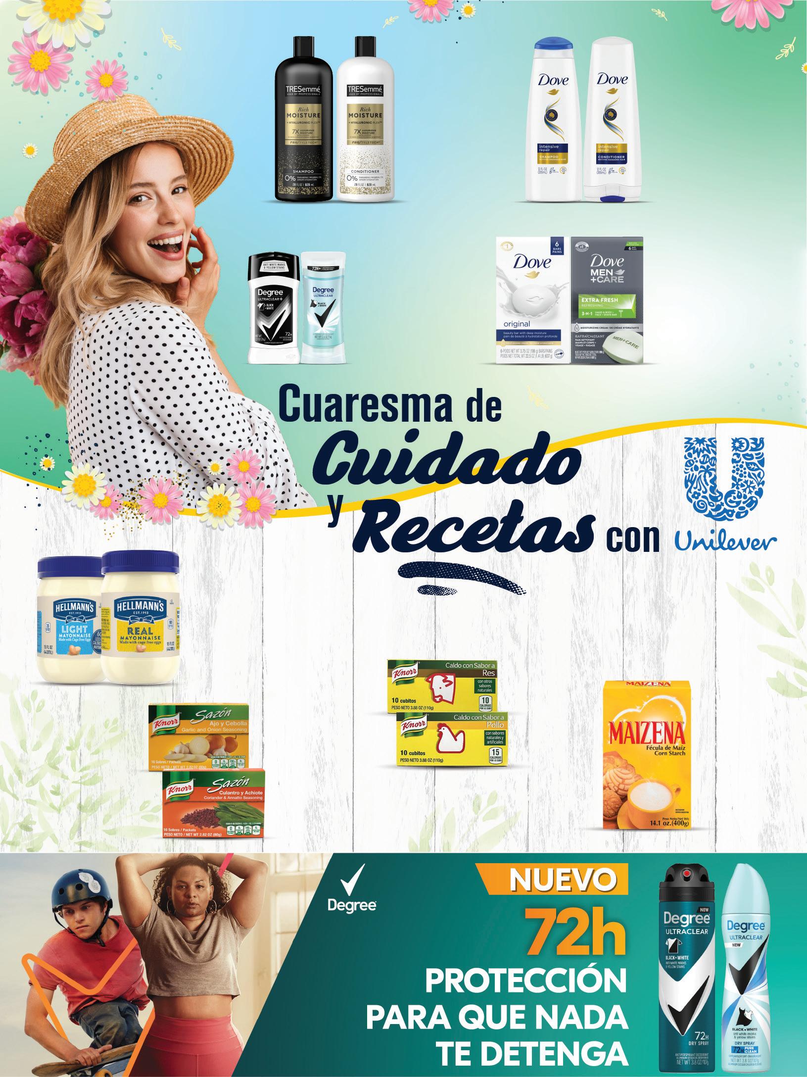 Jabón en Barra Dove Variedad, SVT** Pqte. de 6 un. de 3.75 oz. Reg. $9.99 pqte. 738 pqte. Shampoo o Conditioner Dove Variedad, SVT** Env. de 12 oz. Reg. $4.99 c/u 398 c/u Cubitos Knorr Pollo o Res de 10 un., SVT** Reg. $2.09 c/u Esp. $1.50 c/u 2X $3 Mayonesa Hellmann’s Real o Light, SVT** Env. de 15 oz. Reg. $4.99 c/u 328 c/u Fécula de Maíz Maizena Caja 14.1 oz. Reg. $2.49 c/u Esp. $2.00 c/u 2X $4 Sazón Knorr Variedad, SVT** Caja de 16 un. Reg. $1.99 c/u Esp. $1.50 c/u 2X $3 Desodorantes Degree Solid, SVT** Env. de 2.6 o 2.7 oz. Reg. $4.59 c/u 378 c/u Shampoo o Conditioner TRESemmé Variedad, SVT** Env. de 28 oz. Reg. $6.99 c/u 478 c/u