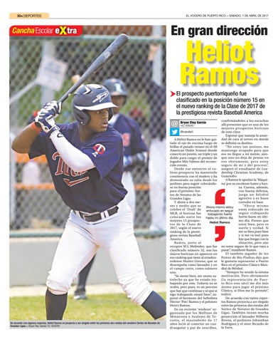 confirmándoles a los escuchas allí presentes que es uno de los mejores prospectos boricuas @bryaneloy5 de esta clase. Expresó que maneja la ansieA Heliot Ramos no le han qui- dad de cara al sorteo en donde tado el ojo de encima luego de se definirá su destino. “No estoy tan ansioso, me brillar el pasado verano en el All American Under Armour donde mantengo ocupado para que conectó un jonrón, un triple y un eso no llegue a mi mente, aundoble para cargar el premio de que uno no deja de pensar en Jugador Más Valioso del recono- eso obviamente, pero estoy seguro de mí y del proceso”, cido evento. Desde ese entonces el va- aseguró el estudiante de Lealioso prospecto ha mantenido dership Christian Academy, de consistencia con el madero y ha Guaynabo. A Ramos le apodan la ‘Máquidemostrado su valía desde los jardines para seguir colocándo- na’ por su excelente bateo y fuerza. Cuenta, además, se en buena posición con buena defensa, para el próximo Sorju e ga u n b é i sb o l teo de Novatos de las agresivo y es buen Grandes Ligas. corredor en base. Y ahora a dos me“A h o r a m i s m o ses y medio que se Ahora mismo estoy estoy enfocado en celebre el ‘Draft’ de enfocado en seguir seguir trabajando MLB, el boricua fue trabajando fuerte fuerte hasta mi últicolocado entre los hasta mi último día. mo día. Pienso que mejores 15 prospecHeliot Ramos estoy bien, pero es tos de la Clase de suerte y verdad. Si 2017, según el nuevo me va bien pues bien ranking de la prestiy si me va mal pues giosa revista Baseball hay que bregar con la America. situación, pero aún Ramos, junto al receptor M.J. Meléndez, que fue no estoy seguro de lo que vaya a clasificado número 32, son los pasar”, manifestó Ramos. El también jugador de los únicos boricuas en aparecer en ese ranking que tiene al estadou- Potros de Río Piedras dijo que nidense Hunter Greene, que se le gustaría representar a Puerto desempeña como lanzador y en Rico en el próximo Clásico Munel campo corto, como número dial de Béisbol. “Siempre he tenido la misma uno. “Se siente bien, me siento sa- motivación. Pero obviamente tisfecho ya que he estado tra- (la representación de Puerbajando por esto. Todavía no se to Rico este año) me dio más acaba, pero pues, es un proceso ánimo para jugar el próximo que hay que continuar y sé que si Clásico, si Dios me lo permite”, sigo trabajando estaré bien”, ex- indicó. De acuerdo con varios experpresó el hermano del futbolista Héctor ‘Pito’ Ramos y el pelotero tos Ramos proyecta a ser elegido entre las primeras dos rondas del Henry Ramos. En un reciente ‘workout’ or- Sorteo de Novatos de Grandes ganizado por los Mellizos de Ligas. También tienen mucha Minnesota y Azulejos de To- proyección el lanzador Wilberto ronto, el maunabeño de 17 Rivera, el jardinero Johnathan años lució al conectar un cua- Rodríguez y el siore Ricardo de drangular y par de sencillos, la Torre.