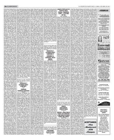 Court entered Default Judgment in favor of Plaintiff, against Defendants. On February 28th, 2016 this Court entered an Order for Execution of Judgment, stating that Defendants defaulted on the repayment obligation to ROOSEVELT CAYMAN ASSET COMPANY, and as of December 6, 2016 he owed RCAC-III the principal amount of $135,833.32; interests since January 1, 2013, at the annual interest rate of five point seventy five percent (5.75%); $4,125.28 in late charges; and $21,600.00 in contractually agreed-upon attorneyʼs fees and legal costs for a total amount of $161,558.60. The records of the case and of these proceedings may be examined by the parties at the Office of the Clerk of the United States District Court, Federal Building, Chardón Avenue, Hato Rey, and Puerto Rico. WHEREAS: Pursuant to the terms of the aforementioned judgment and the order of execution thereof, the following property belonging to the Defendant will be sold at a public auction: “URBANA: Solar radicado en la URBANIZACIÓN ESTANCIAS DE CAMBALACHE, también conocido como VISTAS DE RÍO GRANDE, radicado en el Barrio Canóvanas del término municipal de Canóvanas, Puerto Rico, que se describe en el plano de inscripción, con el número, área y colindancias que se relacionan a continuación: Solar No. 5 del Bloque "J", con una cabida de 1,521.89 metros cuadrados, equivalentes a 0.3872 cuerda. En lindes por el Norte, en dos alineaciones continuas y distintas, una de 25.28 metros lineales, con el solar No. 3 del mismo bloque y otra de 13.57 metros lineales, con el solar No. 4 del mismo bloque; por el Sur, en una distancia de 68.15 metros lineales, con área verde; por el Este, en una distancia de 14.74 metros lineales, con área verde; y por el Oeste, en varias alineaciones distintas y continuas, una de 28.37 metros lineales, con el solar No. 6 del mismo bloque y otra de 23.26 metros lineales, con la Calle No. 3 de la Urbanización. Sobre dicho solar enclava una casa en concreto para fines residenciales.” Property number 15066, recorded at page 211 of volume 372 of Canóvanas, Registry of the Property of Carolina, Third Section. WHEREAS: The property is subject to the following liens: 1. MORTGAGE: In the principal amount of $216,000.00, securing a note payable to DORAL BANK, or its order, with yearly interests set at 5.75% due on May 1st., 2019, appraised at $216,000.00, as per Deed No. 181, executed in San Juan on April 13th., 2004, before Notary Public Reinaldo Segurola Pérez, recorded at page 211 of volume 372 of Canóvanas, property No. 15066, 5th inscription. 2. Senior Liens: None. 3. Junior Liens: MORTGAGE: In the principal amount of $34,000.00, securing a note payable to DORAL MORTGAGE CORPORATION, or its order, with yearly interests set at 8.45% due on September 1st., 2025, appraised at $34,000.00, as per Deed No. 364, executed in Carolina on August 31st., 2005, before Notary Public Norma L. Díaz Serrano, recorded at page 211 of volume 372 of Canóvanas, property No. 15066, 6th inscription. JUDGMENT: Given at the First Instance Court, Municipal Branch of Río Grande, Civil Case No. NFC-120-12-00381, dated June 5th., 2013, followed by “Asociación de Residentes de Vistas de Río Grande I, Inc., versus Owner, for Collection of Money, in the principal amount of $2,924.32, plus interests and costs, recorded on October 3rd., 2013, at page 71, Order 200 of Judgments Book No. 2. FEDERAL LIEN: In favor of UNITED STATES OF AMERICA, in the principal amount of $158,973.39, owed by José Carlos Clemente Andino with Social Security No. XXX-XX-9746, Notification No. 940 582 913, Presented on June 4th., 2013, for federal tax, at page 233, Entry No. 2 of Book 3 of Federal Taxes. FEDERAL LIEN: In favor of UNITED STATES OF AMERICA, in the principal amount of $7,330.16, owed by José C. Clemente Andino with Social Security No. XXX-XX9746, Notification No. 964 911 313, Presented on November 21st., 2013, for federal tax, at page 7, Entry No. 5 of Book 4 of Federal Taxes. FEDERAL LIEN: In favor of UNITED STATES OF AMERICA, in the principal amount of $9,613.88, owed by José Carlos Clemente Andino with Social Security No. XXXXX-9746, Notification No. 102 785 114, Presented on July 18th., 2014, for federal tax, at page 35, Entry No. 2 of Book 4 of Federal Taxes. Potential bidders are advised to verify the extent of preferential liens with the holders thereof. It shall be understood that each bidder accepts as sufficient the title and that prior and preferential liens to the one being foreclosed upon, including but not limited to any property tax, liens, (express, tacit, implied or legal), shall continue in effect it being understood further that the successful bidder accepts them and is subrogated in the responsibility for the same and that the bid price shall not be applied toward their cancellation. The present property will be acquired free and clear of