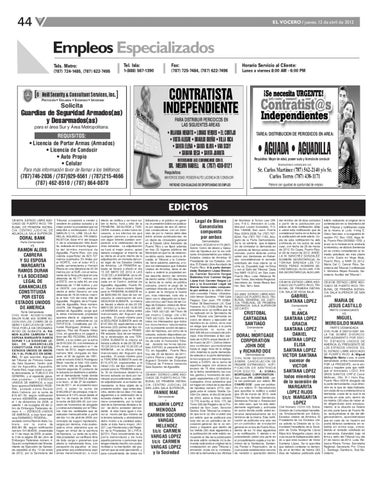 Legal de Bienes Gananciales compuesta por ambos Demandados Civil Núm. KCD2012-0175 (807). Sobre: Cobro de dinero y Ejecución de hipoteca por la vía ordinaria. Emplazamiento por edicto. Estados Unidos de América. El Presidente de los Estados Unidos. El Estado Libre Asociado de Puerto Rico. A la parte demandada: Benjamín López Mendoza, Carmen Socorro Vargas Meléndez t/c/c Carmen Vargas López t/c/c Carmen Vargas López y la Sociedad Legal de Bienes Gananciales compuesta por ambos a su última dirección conocida Física: Urbanización Venus Gardens, 1768 Calle Pegaso, San Juan, PR 00969. Postal 38 Beechwood LN, East Hanover, NJ, 07936-2948. Por la presente se le (s) notifica que se ha radicado en la Secretaría de este Tribunal una Demanda en cobro de dinero y ejecución de hipoteca en su contra, en la cual se alega que adeuda a la parte demandante la suma de $42,593.69 por concepto de principal, más intereses al tipo pactado de 4.250% anual desde el 1 de marzo de 2011. Dichos intereses continúan acumulándose hasta el pago total de la obligación. Además la parte demandada adeuda a la parte demandante los cargos por demora equivalentes a 5.000% de la suma de aquellos pagos con atrasos en exceso de 15 días calendarios de la fecha vencimiento; las costas, gastos y honorarios de abogado equivalentes a $7,500.00 y cualquiera otros adelantos que se hagan en virtud de la escritura de hipoteca número 2775, otorgada ante el notario Yivette Carrión De Jesús, el día 25 de junio de 2003, sobre la finca número 13,779 inscrita al folio 170 del Tomo 339 del Registro de la Propiedad de San Juan, Sección Quinta. Este Tribunal ha ordenado que se le (s) cite a usted (es) por edicto que se publicará una sola vez en un periódico de circulación general. Se le (s) emplaza y requiere que dentro de los treinta (30) días siguientes a la publicación de este edicto excluyendo el día de la publicación de este edicto conteste (n) la demanda radicando el original de la contestación en este Tribunal y enviando copia de la contestación de la demanda a las oficinas
