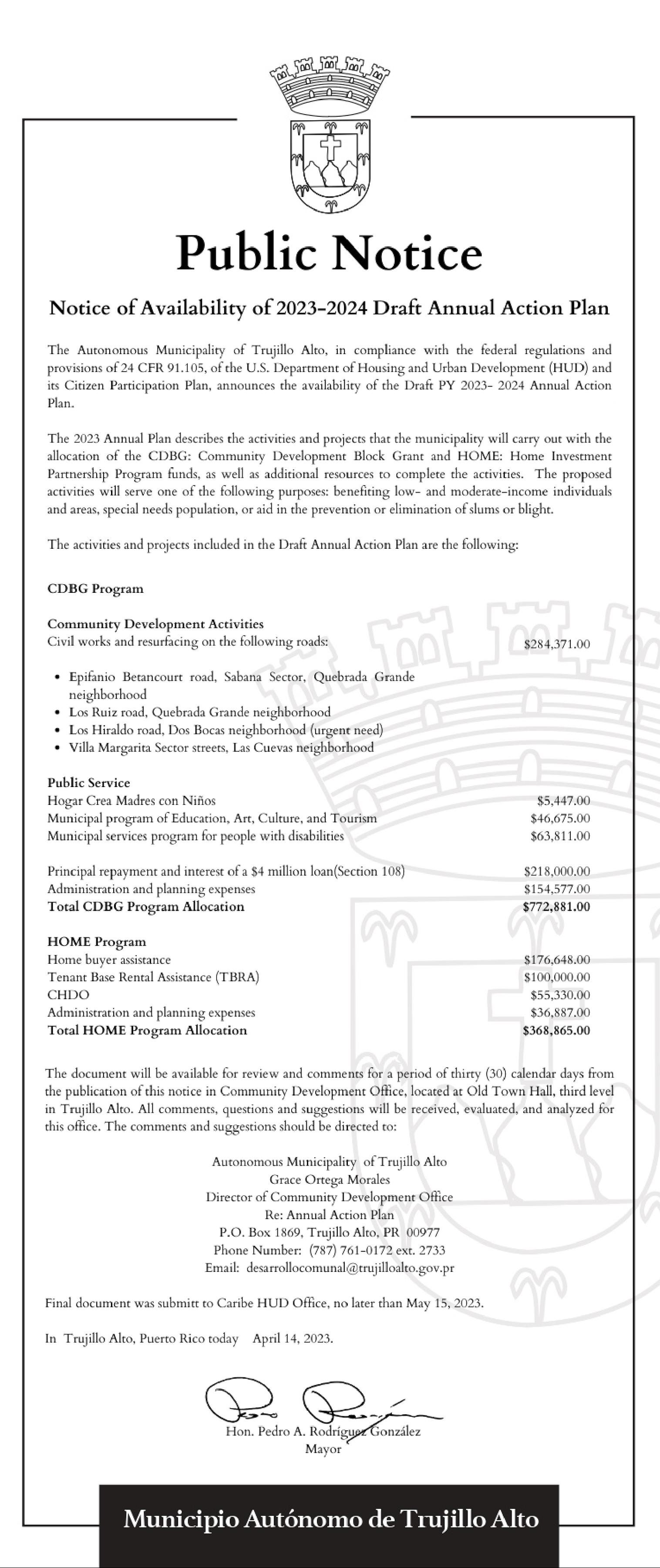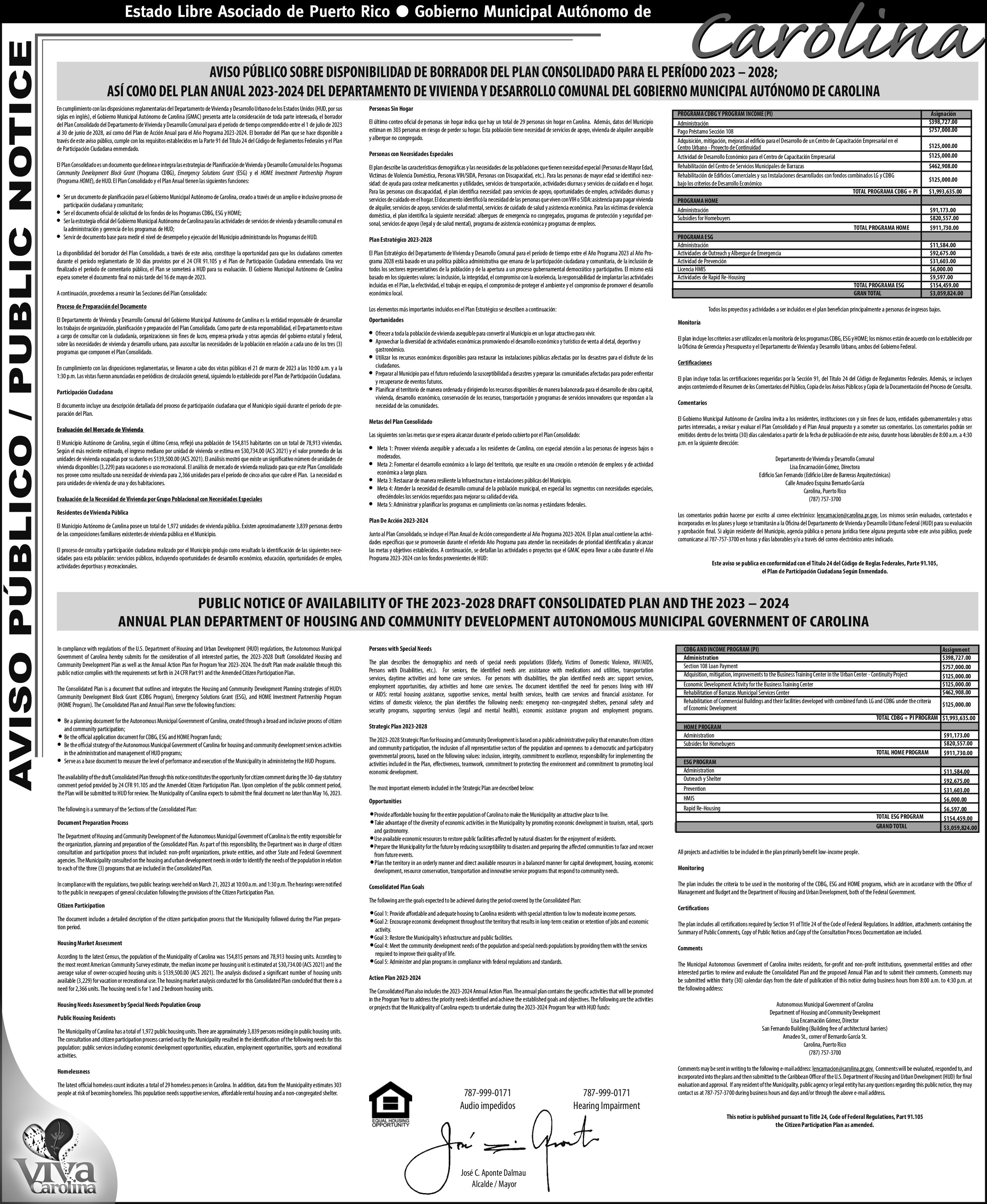 Aviso de Disponibilidad del Borrador del Plan de Acción Anual 2023- 2024 El Municipio de Cabo Rojo, en cumplimiento con las regulaciones federales del 24 CFR 91.105, del Departamento de la Vivienda Federal (HUD, por sus siglas en inglés) y el Plan de Participación Ciudadana del municipio, anuncia la disponibilidad del Borrador del Plan de Acción Anual 2023- 2024. El Plan Anual del año programa 2023- 2024 describe los proyectos y actividades que el Municipio estará llevando a cabo con los fondos de CDBG: Community Development Block Grant, así como fondos adicionales para completar las actividades. Las actividades propuestas en el Borrador cumplen con alguno de los siguientes objetivos nacionales: beneficiar a familias de ingresos bajos y moderados, poblaciones con necesidades especiales o ayuda en la prevención o eliminación de los arrabales.