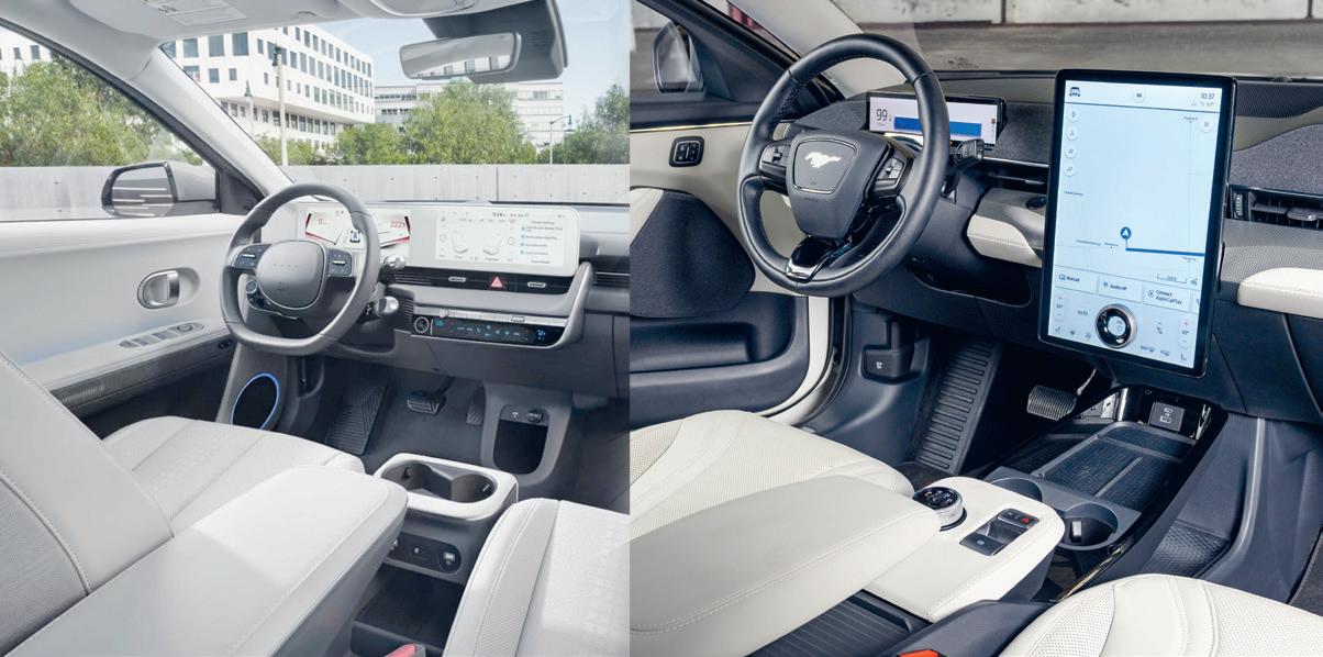 como el Ioniq 5 ofrecen interiores cómodos y atractivos con un montón de características útiles. Al contrario de lo que su diseño exterior podría hacerte creer, el interior del Ioniq 5 es sorprendentemente convencional. Su amplia pantalla táctil de 12.3 pulgadas se funde a la perfección con el panel de instrumentos digital y es fácil de usar con controles de respuesta rápida. El Mach-E va por un camino diferente con una pantalla aún más grande, de 15.5 pulgadas, que se fija a la columna central como una tableta. Hay un control físico, que es un buen detalle, y la pantalla en sí es bastante sensible y fácil de navegar. También hay conectividad inalámbrica para Apple CarPlay y Android Auto, a diferencia de una conexión por cable en el Ioniq 5, y el sistema de asistencia
