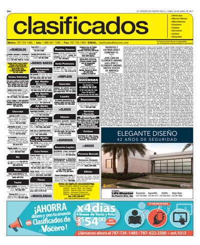 ¿ESTAS A PIE? Unidades nuevas y usadas en liquidación Apt. Alquiler pagos bajitos. Sin crédito, Río Piedras crédito afectado. ¡Llama a Mezcla! 787 415-7008 PUEBLO, estudios, 1, 2 y 3 hab., Incl agua y luz. Se acepta ¿Necesitas un auto, no tienes Plan 8. 767-1020, 962-3344 pronto, crédito afectado? Tengo el financiamiento que URB VALLE UNIVERSITARIO, 2 necesitas. ¡Llama! Ramón cuartos incluye agua y luz, Parrilla 787-914-6752 $450. 787 949-8439 El inventario más grande en Chevrolet, GMC, Buick, Cadillac de PR listo para entrega. ¡Llama ahora a Sergio Negrón! 787-619-1471 Regalo cuenta Chev Equinox '14, F/P, 4ptas, Paga $289 mens. 939 640-7426