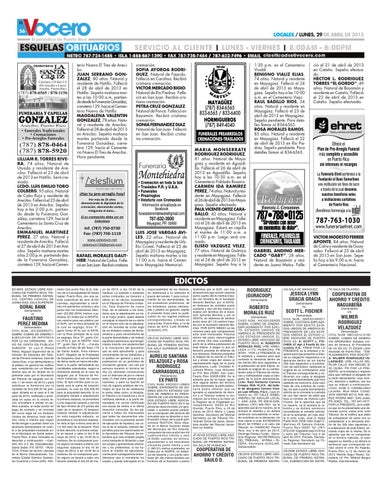 1:30 p.m. en el Cementerio Vivaldi. BENIGNO VIALIZ ELIAS, 74 años. Natural y residente en Mayagüez. Falleció el 24 de abril de 2013 en Mayagüez. Sepelio hoy a las 10:00 a.m. en el Cementerio Viejo. RAUL BADILLO RIOS, 54 años. Natural y residente en Mayagüez. Falleció el 23 de abril de 2013 en Mayagüez. Sepelio pendiente. Para detalles llamar al 834-6565. ROSA MORALES RAMOS, 85 años. Natural y residente en Mayagüez. Falleció el 22 de abril de 2013 en Río Piedras. Sepelio pendiente. Para detalles llamar al 834-6565.
