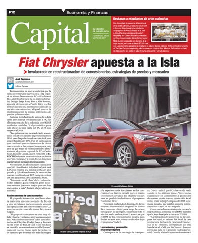 En momentos en que se anticipa que la venta de vehículos nuevos en la Isla seguirá en ritmo descendente, FCA Caribbean LLC, distribuidor local de las marcas Chrysler, Dodge, Jeep, Ram, Fiat y Alfa Romeo, apuesta plenamente a Puerto Rico y se ha embarcado en una reestructuración de su red de concesionarios, al igual que en la implementación de nuevas estrategias de precios y de mercadeo. Aunque la industria de autos de la Isla cerró 2016 con un crecimiento de 5.7%, fue el tercer peor año de la industria, con 86,053 unidades vendidas. Y el pronóstico para este año es de una caída del 2% al 4% con respecto al 2016. “Los primeros tres meses del año se continuó con el crecimiento experimentado en 2016, pero después vino el mes de abril, con una reducción del 16%. Fue un jamaqueón que confirmó que estábamos en lo cierto con respecto a las proyecciones para este año, ya que mayo se ve muy similar a abril,” sostuvo el gerente regional de FCA Caribbean, Ricardo García, quien comentó al EL VOCERO durante una entrevista exclusiva que “sin embargo, y a pesar de eso, tenemos que llevar un mensaje de entusiasmo.” No obstante, en el cumulativo hasta abril con 26,119 unidades, la industria local está 2.6% por encima a la misma fecha del año pasado, y coincidentalmente, la venta de las marcas combinadas de FCA está por encima del año pasado un 2.6% a la misma fecha. “Estamos con el ‘flow’ de la industria. Todos estamos para competir, pero nosotros tenemos que estar mejor que eso, hay que aspirar a más,” destacó el ejecutivo automotriz.