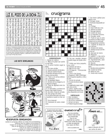 35. Voz que, repetida, designa un pueblo negro del Sudán oriental. 37. Prefijo que indica pequeño, breve, corto. 39. Símbolo del lutecio. 40. Mecía en la cuna. 43. ("El mago de ...") Famoso relato infantil. 44. Cuezo a las brasas. 45. (Eugenio d’, 1882-1954) Importante ensayista español y crítico de arte. 47. Acción de extradir. 49. Acción de aforar (valuar o medir). 50. Legalmente capaz o apto para una acción. 52. Indica, significa algo. 53. Mariposa de colores muy varios dispuestos en mosaico. VERTICALES 2. Ante meridiano. 3. Apócope de tanto. 4. Uno de los continentes. 5. Cerrad con lacre. SOLUCION ANTERIOR 6. Probaré el gusto de algo.