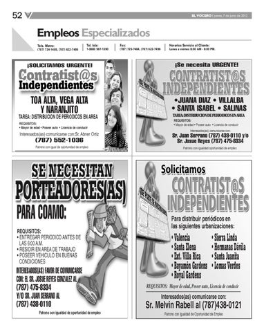 •JUANA DIAZ • VILLALBA • SANTA ISABEL • SALINAS TAREA:DISTRIBUCION DE PERIODICOS ENAREA REQUISITOS: • Mayor de edad • Poseer auto • Licencia de conducir Interesados(as) comunicarse con: