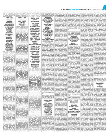 Parte Demandada CASO NUM. DCD2013-0137 SALÓN NÚM.: 504 ACCIÓN CIVIL DE COBRO DE DINERO Y EJECUCION DE HIPOTECA POR LA VIA ORDINARIA. EMPLAZAMIENTO POR EDICTO. ESTADOS UNIDOS DE AMÉRICA. EL PRESIDENTE DE LOS ESTADOS UNIDOS. SS. ESTADO LIBRE ASOCIADO DE PUERTO RICO. D: JOHN DOE Y RICHARD ROE COMO POSIBLES HEREDEROS DE LA SUCESION DE AURORA BARRAGAN VAZQUEZ Quede (n) emplazado (s) y notificado (s) que en este Tribunal se ha radicado Demanda sobre Ejecución de Hipoteca por la Vía Ordinaria en la que se alega que usted (es) le adeuda (n) a la parte demandante lo siguiente: La suma de $471,870.69 más intereses sobre dicha suma al tipo convenido de 6.125% anual desde el 1ro. de febrero de 2010, hasta su completo pago, más cualesquiera sumas de dinero por concepto de primas de seguro hipotecario y riesgo, recargos por demora, así como de cualesquiera otras cantidades pactadas en la escritura de primera hipoteca, desde la fecha antes mencionada y hasta el total pago de las mismas, más la cantidad estipulada de $52,700.00 para costas, gastos y honorarios de abogados. La propiedad hipotecada cuya ejecución se solicita tiene la siguiente identificación y localización: URBANA: Solar marcado con el número 28 del plano de inscripción de la Urbanización Garden Hills Estates, radicada en la Urbanización Torrimar Barrios Juan Domingo, Frailes y Pueblo Viejo de Guaynabo, Puerto Rico, con un área superficial de 600.10 metros cuadrados. En lindes por el Norte, en una distancia de 29.99 metros, con el solar número 29; por el Sur, en una distancia de 29.99 metros, con el solar número 27; por el Este, en una distancia de 20.01 metros, con el solar número 23 y por el Oeste, en una distancia de 20.01 metros con la calle número 2 de dicha urbanización. Enclava casa. FINCA NUMERO: 26219 Inscrita al folio 210 del tomo 653 de Guaynabo, Registro de Guaynabo. Se le advierte que si no contesta la demanda, radicando el original de la contestación en este Tribunal y enviando copia de la misma al LCDO. RAFAEL BRAS BENITEZ del Bufete VAZQUEZ & VIZCARRONDO LLP, a su dirección P.O. Box 195389, San Juan, Puerto Rico 009195389, Tel. (787) 999-5252, Fax (787) 751-1038 dentro del término de treinta (30) días de la publicación de este edicto en un periódico de circulación diaria, se le (s) anotará la rebeldía y se le (s) dictará sentencia en su contra, concediendo el remedio solicitado, sin más citarle (s) ni oírle (s). EXPEDIDO BAJO MI FIRMA Y SELLO DE ESTE TRIBUNAL. En Bayamón, Puerto Rico, hoy día 12 de junio de 2013. Ruth N. Aponte Cotto, Sec. Reg. Interina Danilsa Ortiz Ramos, Sec. Aux. del Tribunal Por: Sub-Secretaria (o).