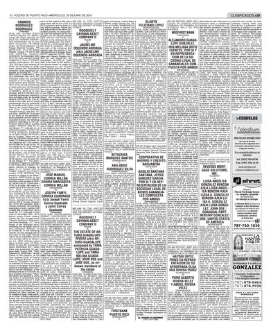 STATES DISTRICT COURT further that the successful bidFOR THE DISTRICT OF PUER- der accepts them and is subrogTO RICO ated in the responsibility for the same and that the bid price shall not be applied toward their cancellation. The present property will be acquired free and clear of junior>MIÉRCOLES, liens. WHEREAS:29 For EL VOCERO DE PUERTO all RICO DEJUNIO DE 2016 Plaintiff the purpose of the first judicial vs. sale, the minimum bid agreed upon by the parties in the mort- M R - 2 8 9 I N T H E U N I T E D gage deed will be $151,022.47 STATES DISTRICT COURT for the property and no lower of- FOR THE DISTRICT OF PUERfers will be accepted. Should the TO RICO first judicial sale of the above deDefendant scribed property be unsuccessC I V I L N O . 1 5 - 2 3 5 4 ( C C C ) ful, then the minimum bid for the FORECLOSURE OF MORT- property on the second judicial GAGE (IN REM) NOTICE OF sale will be two-thirds the SALE TO: YAMARIS RODRIG- amount of the minimum bid for Plaintiff UEZ RODRIGUEZ HC 01 Box the first judicial sale. The minimvs. 6016 Guayanilla, PR 00656 um bid for a third judicial sale, if Paseo de Santa Bárbara 175 the same is necessary, will be Paseo Mármol Gurabo, PR one-half of the minimum bid 00778-5137, 175 F-27 Paseo agreed upon the parties in the Mármlo. Gurabo, PR 00778 and aforementioned mortgage deed. T H E G E N E R A L P U B L I C ; (30 PR Laws Ann. § 2721, MortWHEREAS: On December 30th, gage and Property Registry Act, Defendant 2015 this Court entered Default Act. No. 198, Article 221, as Judgment in favor of Plaintiff, amended). WHEREAS: Said CIVIL NO. 16-1511 (JAG) COLagainst Defendants. On May sale to be made by the appoin- LECTION OF MONIES AND .3rd, 2016 this Court entered an ted Special Master is subject to FORECLOSURE OF MORTOrder for Execution of Judg- confirmation by the United GAGE SUMMONS BY PUBLICment, stating that Defendants States District Court for the Dis- A T I O N T O : J A C K E L I N E defaulted on the repayment ob- trict of Puerto Rico and the deed OQUENDO-ARRIAGA a/k/a ligation to ROOSEVELT CAY- of conveyance and possession JACKELINE OQUENDO-ARREMAN ASSET COMPANY II , and to the property will be executed AGA QQ-16 Calle Este 33, Urb. as of November 16th, 2015, De- and delivered only after such Santa Juanita Bayamón, PR fendants owed the principal confirmation. NOW THERE- 00956 1133 North 20th Street amount of $147,592.28; ac- FORE, public notice is hereby New Jersey, NJ 08105. The crued interest since October 1st, given that the appointed Special plaintiff has filed proceedings for 2014, at the annual interest rate Master, pursuant to the provi- foreclosure of mortgage exof three point zero six thousand sions of the Judgment herein be- ecuted by the defendants on a four hundred eight percent fore referred to, will, on the 18th property situated at: QQ-16 (3.06408%); $224.19 in late day of August, 2016, at 2:15 pm, Calle Este 33, Urb. Santa Juancharges; and $14,700.00 in con- in the Office of the Clerk of the ita, Bayamón, PR 00956. Pursutractually agreed-upon attorneyʼs United States District Court, ant to the Order for Service by fees and legal costs, for the total Room 150, Federal Building, Publication entered on 6/10/16 amount of $162,516.47 The re- Chardon Avenue, Hato Rey, Pu- by the Honorable Jay A. Garcíacords of the case and of these erto Rico in accordance with 28 Gregory, United States District proceedings may be examined U.S.C. § 2001, will sell at public Judge (Docket No. 6), you are by the parties at the Office of the auction to the highest bidder, the hereby SUMMONED to appear, Clerk of the United States Dis- property described herein, the plead or answer the Complaint trict Court, Federal Building, proceeds of said sale to be ap- filed herein no late than thirty Chardón Avenue, Hato Rey, Pu- plied in the manner and form (30) days after publication of this erto Rico. WHEREAS: Pursuant provided by the Courtʼs Judg- Summons by serving the originto the terms of the aforemen- ment. Should the first judicial al plea or answer to the United tioned judgment and the order of sale set hereinabove be unsuc- States District Court for the Disexecution thereof, the following cessful, the second judicial sale trict of Puerto Rico, and serving property belonging to the De- of the property described in this a copy to counsel for plaintiff: fendants will be sold at a public Notice will be held on the 25th Sergio A. Ramírez de Arellano auction: “URBANA: Solar No. 27 day of August, 2016, at 2:15 pm, Law Offices, at Banco Popular del Bloque “F”, radicado en la in the Office of the Clerk of the Center, Suite 1022, 209 Muñoz URBANIZACIÓN PASEO DE United States District Court loc- Rivera Avenue, San Juan, PR SANTA BARBARA, localizado ated at the address indicated 00918-1009, telephone numen el Barrio Rincón del Munici- above. Should the second judi- bers 787-765-2988; 787-764pio de Gurabo. Tiene una ca- cial sale set hereinabove be un- 6392; sramirez@sarlaw.com. bida de 338.0000 metros cuad- successful, the third judicial sale This Summons shall be pubrados. En lindes por el Norte, en of the property described in this lished by edict only once in a una distancia de 13.00 metros, Notice will be held on the 1st day newspaper of general circulacon la Calle No. 6; por el Sur, en of September, 2016, at 2:15 pm, tion in the Island of Puerto Rico. una distancia de 13.00 metros, in the Office of the Clerk of the Within ten (10) days following con el solar No. 2 del Bloque “F”; United States District Court loc- publication of this Summons, a por el Este, en una distancia de ated at the address indicated copy of this Summons and the 26.00 metros, con el solar No. above. In San Juan, Puerto Complaint will be sent to defend28 del Bloque “F”; y por el Rico, this 16th day of June, ants JACKELINE OQUENDOOeste, en una distancia de 2016. Hans López Stubbe Ap- ARRIAGA a/k/a JACKELINE OQUENDO-ARREAGA, by certi26.00 metros, con el solar No. pointed