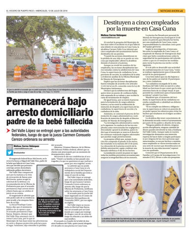del acusado. Mientras, Vivianne Marrero, de la Oficina del Defensor Público federal, afirmó que su cliente está atravesando por un momento de @melisaivelise desesperación y dolor. McGiverin le dio sus condolencias al acuEl magistrado federal Bruce McGiverin, no le sado. “Usted y su familia ya han pasado una revocó la fianza a Miguel del Valle Díaz, padre de tragedia y lo que no queremos es que vuelvan a la bebé que falleció en Casa Cuna, pasar por otra tragedia”, acotó. sino que decidió que permaneLe advirtió que no podrá cerá bajo arresto domiciliario acercarse a Casa Cuna ni a la utilizando grillete electrónico. trabajadora social del DepartaDel Valle Díaz compareció mento de la Familia que tenía a ayer por la mañana a la vista cargo el caso de su hija. de revocación de fianza ante Del Valle López se entregó McGiverin, quien acogió la ayer a las autoridades federales, solicitud de la defensa y la luego de que la jueza Carmen recomendación de la Oficina de Consuelo Cerezo ordenara su Probatoria para que el acusado arresto; ello, luego de que la permanezca bajo arresto domiOficina de Probatoria, notificara ciliario hasta que se celebre el sobre las amenazas a Casa Cuna. juicio en su contra. El acusado pasó la noche del El magistrado le advirtió que lunes ingresado en el Centro de sólo podrá salir de su residencia Detención Metropolitano de Se alega que el pasado 6 de para acudir a las exequias fúneGuaynabo (MDC, por sus siglas julio, Miguel Del Valle López bres de su hija. en inglés). llamó en repetidas ocasiones La fiscal Penélope CasteDel Valle López se encona una trabajadora social del llanos dijo que el ministerio traba en libertad bajo fianza, Departamento de la Familia público no se opone a que tras ser acusado por un Gran y de forma amenazante le dijo el acusado permanezca bajo Jurado por cargos por trasiego “da la cara por mi hija”. fianza. Empero, destacó que de drogas y uso de un arma de > Suministrada Del Valle Díaz amenazó con tifuego en relación a un delito de rotear Casa Cuna, por lo que el narcotráfico. Municipio de San Juan tomó las advertencias El acusado es el padre de la bebé de dos en serio y dispuso protección policiaca para años Emiliana del Valle, quien murió ahogada el lugar. Asimismo, dijo entender la pérdida el 4 de julio en una piscina en Casa Cuna. >mcorrea@elvocero.com