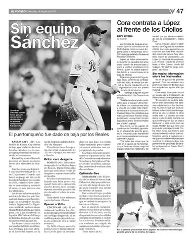 El puertorriqueño fue dado de baja por los Reales KANSAS CITY -(AP)- Los Reales de Kansas City dieron de baja ayer al abridor boricua Jonathan Sánchez, que ha pasado varios problemas en el montículo recientemente. Kansas City anunció la medida antes del juego nocturno frente a los Marineros de Seattle. Sánchez tenía una foja de 16 con una efectividad de 7.76 en 12 aperturas. El zurdo, que lanzó un juego sin hit con la franela de San Francisco en julio de 2009, permitió siete carreras en una entrada y un tercio el lunes, en una derrota ante los Marineros. Los Reales se hicieron de los servicios de Sánchez y del lanzador de las menores Ryan Verdugo en noviembre pasado. Ambos llegaron de los Gigantes a cambio del jardinero dominicano Melky Cabrera, que batea para .353 y fue nombrado el Jugador Más Valioso del Juego de Estrellas disputado la semana anterior en Kansas City. Los Reales convocaron de la sucursal de la Triple A en Omaha a Verdugo, para que abriera el duelo del martes por la