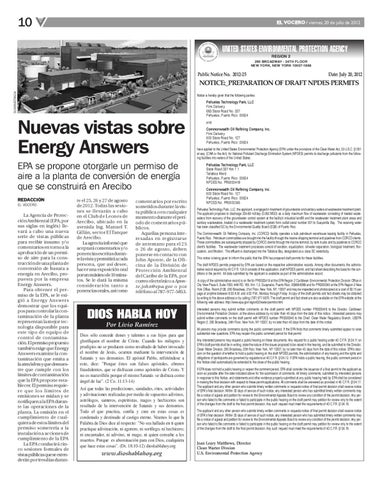 La Agencia de Protección Ambiental (EPA, por sus siglas en inglés) llevará a cabo una nueva serie de vistas públicas para recibir insumo y/o comentarios en torno a la aprobación de un permiso de aire para la construcción de una planta de conversión de basura a energía en Arecibo, propuesta por la empresa Energy Answers. Para obtener el permiso de la EPA, se le exigió a Energy Answers demostrar que los equipos para controlar la contaminación de la planta representan la mejor tecnología disponible para este tipo de equipo de control de contaminación. El permiso propuesto también exige que Energy Answers examine la contaminación que emita a la atmósfera y que demuestre que cumple con los límites de contaminación que la EPA propone establecer. El permiso requiere que los límites de emisiones se midan y se notifiquen a la EPA durante las operaciones de la planta. La omisión en el cumplimiento de cualquiera de estos límites del permiso sometería a la instalación a acciones de cumplimiento de la EPA La EPA conducirá cinco sesiones formales de vistas públicas que se extenderán por tres días duran-