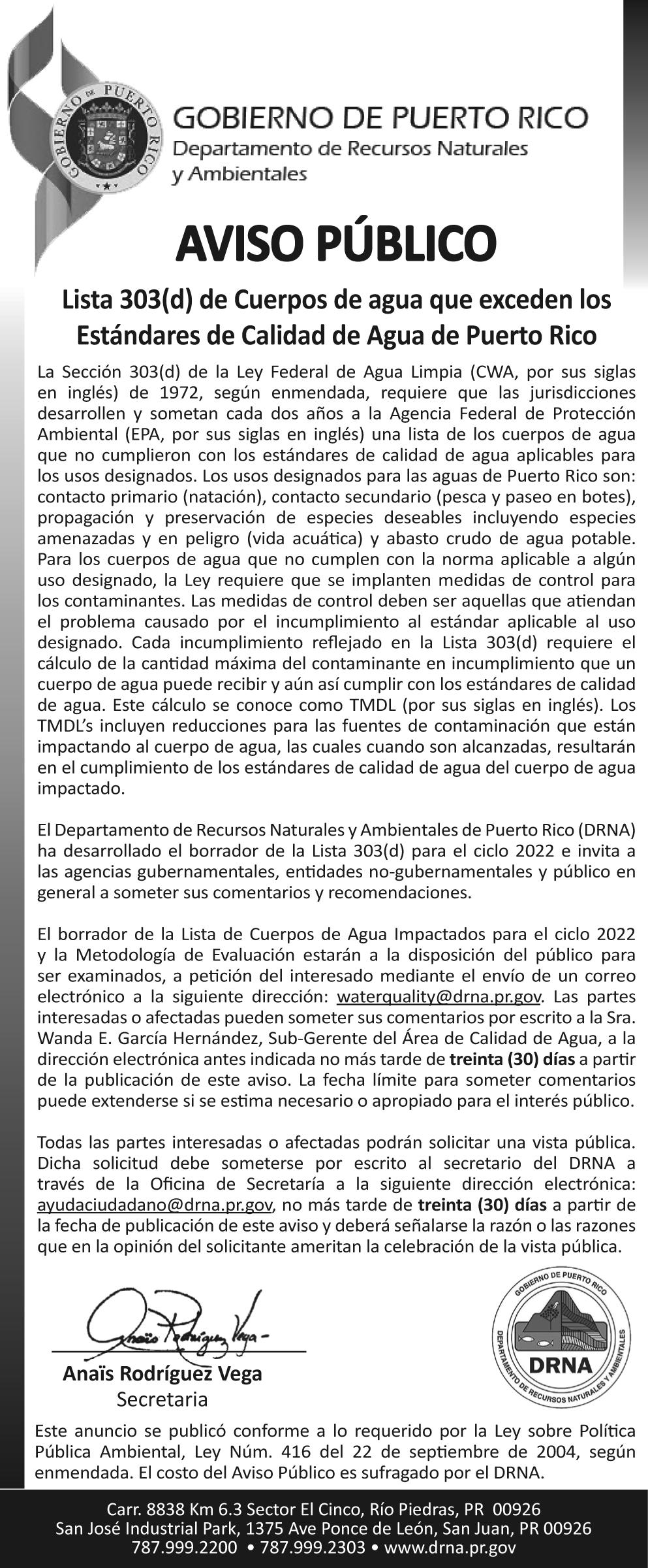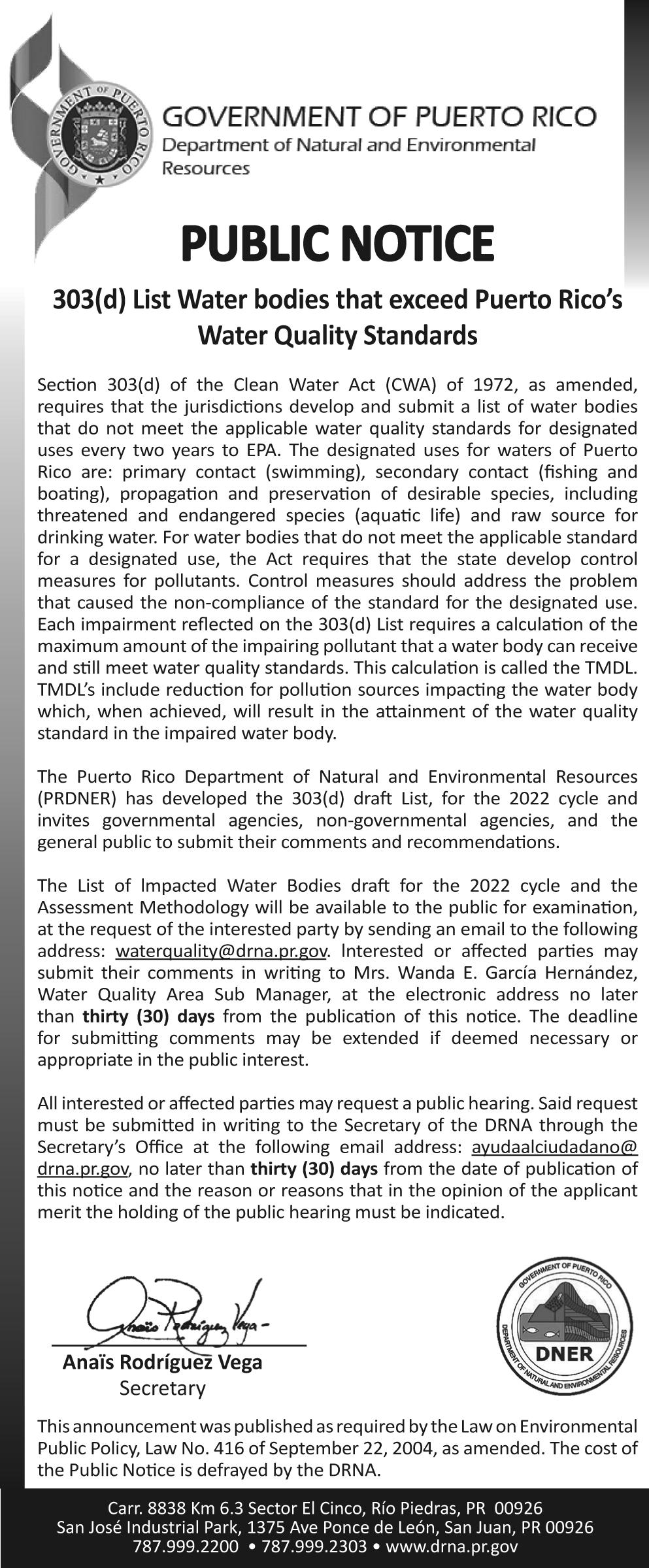 Pedro Pierluisi gobernadortambién la Agencia federal de Protección Ambiental (EPA) pudiera tener jurisdicción, entre otras. Así que yo estoy pendiente. Lo que quiero es que la secretaria cumpla con su deber ministerial. Si se le presentan querellas y hay algún tipo de violación de ley, hay que investigarlo y llegar a una conclusión”, declaró.
