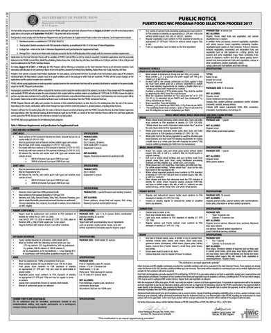 PUERTO RICO WIC PROGRAM FOOD SELECTION PROCESS 2017 The Puerto Rico Department of Health announces that the PR WIC will begin the new Food Selection Process on August 21 of 2017 and will receive food products applications and samples until September 19 of 2017. This period will not be extended. Food products must comply with the Minimum Requirements and Specifications for Supplemental Foods in order to be evaluated. Such requirements include: 1. Nutritional content as established in 7 CFR §246.10(e)(12). 2. Food product labels in accordance with FDA standards of identity, as established in Title 21 of the Code of Federal Regulations. 3. Package Size – refers to the Table 4: Minimum Requirements and Specifications for Supplemental Foods. 4. Average Price – based on an island wide retail price survey for the list of all food products that comply with the minimum nutrition requirements. Applications for the Food Selection Process will be available at PR WIC Central Office or sent by email as requested. Completed applications must be personally delivered to the PR WIC Central Office, World Plaza Building, Muñoz Rivera Ave. #268, Hato Rey, 6th Floor, from 8:00 am to 12:00 pm and from 1:00 to 3:00 pm and must be addressed to the PR WIC Nutrition Division. On Friday, August 18 of 2017, at 9:30 am, the WIC Program will be offering an orientation on the Food Selection Process to all interested providers. Such orientation will take place in the Conference Room of the Central Office, located in the World Plaza Building, Muñoz Rivera Ave. #268, Hato Rey, 6th Floor. Providers must submit a separate Food Product Application for each product, accompanied with one (1) sample of the food product and a copy of the product’s nutritional label. All food product samples must be in good condition and in the package in which they are marketed. PR WIC will not accept changes on the applications and the product samples once submitted. PR WIC will not accept applications or mock-up product samples based on the commitment that they will be provided, distributed or available to the general public subject to the WIC Program’s authorization. Food products submitted to PR WIC will be evaluated for nutrition content using the nutrition label of the products, to analyze if they comply with FDA regulations and standards. PR WIC will only consider the price of products that comply with the nutrition content as established in 7 CFR §246.10. PR WIC reserves the right to perform any laboratory nutrition test to verify the nutrition content claimed in any authorized food product at any time. Such laboratory test must be paid in full by the provider. Failure to do so will be considered sufficient cause to eliminate the product from the PR WIC Authorized Food List. PR WIC Program Director will notify each provider the outcome of their submitted products, no later than five (5) working days after the end of the process. Depending on the results, notifications will be done through two types of letters (selected products vs. denied products, including denial reasons). Providers will have five (5) working days after the notice of denial to request an informal hearing with the PR WIC Executive Director, Nutrition Division Supervisor and Legal Advisor. After the informal hearing, all determinations made by the PR WIC as a result of the Food Selection Process will be firm and final; applicants cannot appeal the PR WIC decision for the selection or denial of any food product. The PR WIC will accept applications for the following food categories: