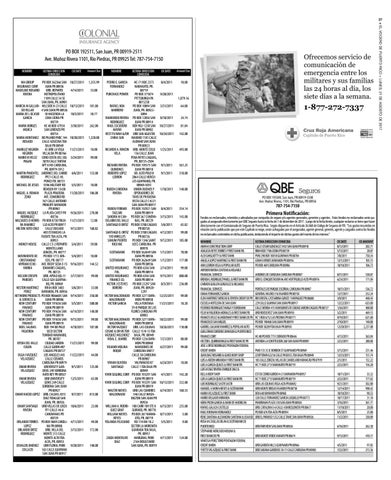 Fondos no reclamados, retenidos y adeudados por compañía de seguro y/o agentes generales, gerentes y agentes. Estos fondos no reclamados serán pagados al asegurado directamente por QBE Seguros hasta la fecha de 1 de diciembre de 2017. Luego de la fecha límite, cualquier reclamo se tiene que hacer directamente con el Comisionado de Seguros de Puerto Rico. Según dispuesto en el Artículo 26.060 de Código de Seguros de P.R. “Los gastos incurridos en relación con la publicación que por este Capítulo se exige, serán sufragados por el asegurador, agente general, gerente, agente y cargados contra los fondos no reclamados contenidos en dicha publicación, deduciendo el importe de dichos gastos del monto de los mismos.” NOMBRE ABAR-K CONSTRUCTION CORP ADALICIA REYES TORRES Y FIRST BANK P.R. ALEX GHIGLIOTTY & FIRST BANK ANGELA LOPEZ MARTINEZ & FIRST BANK P.R. ANN LEBRON VEGA & POPULAR AUTO ARYDIER RIVERA CENTENO & RELIABLE FINANCIAL SERVICES BRENDA L RODRIGUEZ PANELL & FIRST BANK P.R. CARMEN GUILLEN GONZALEZ & RELIABLE FINANCIAL SERVICES DIANA FERNANDEZ GARCIA ELBA MARTINEZ MERCAD & TOYOTA CREDIT DE PR ESCUELA HOTELERA DE SAN JUAN FEDERICO RODRIGUEZ VARGA Y EUROBANK FELIX M FIGUEROA MORALES & FIRST BANK P.R. FRANCES VELEZ ALMODOVAR Y FIRST BANK DE PR FRANCISCO SAN MIGUEL GABRIEL GALIANO RAMIREZ & POPULAR AUTO GUILLERMO CORDERO JOHNSON & PUERTO RICO FINANCE CORP. HECTOR L QUIRINDONGO & FIRST BANK DE PR JOSE L ORTIZ RODRIGUEZ PENTAGON FEDERAL CREDIT UNION JUAN DIAZ ROSARIO & GUICO BODY SHOP LUIS A ARZON MIRANDA Y FIRST BANK P.R. LUIS A GARCIA QUILES & FIRST BANK P.R. LUIS M DIAZ RIVERA ENRIQUE DIAZ & BELLA BODY SHOP LUIS A GARCIA QUILES & FIRST BANK P.R. LUIS RODRIGUEZ SASTR SASTR MANUEL A MORA NIEVES & SCOTIABANK MARIA VELAZQUEZ & FIRST BANK MARIO DELGADO MIRANDA NORA PICON GARCIA & BANK OF AMERICAN RAFAEL GALAZA CASTELLO RAUL R ROMAN HERNANDEZ RENE SANTANA ALEXANDRA SANTANA & USAASB ROSA M CASILLAS DILAN & SCOTIABANK DE PUERTO RICO STEPHANIE MERCADO MOLINA & FIRST BANK DE PR VANESSA PEREZ TORO PENTAGON FEDERAL CREDIT UNION YVETTE VELAZQUEZ & FIRST BANK