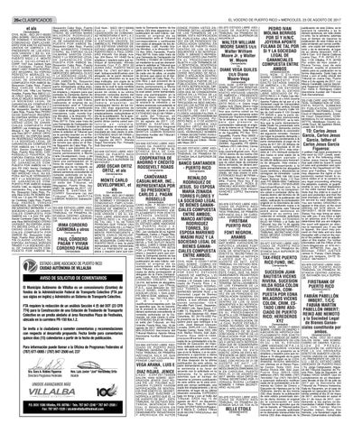 CANÓVANAS REINALDO CASUALWEAR, INC., RODRIGUEZ DE REPRESENTADA POR JESUS, SU ESPOSA SU PRESIDENTE MARIA ZENAIDA CARLOS J. PAGÁN TORRES FLORES Y ROSSELLO LA SOCIEDAD LEGAL Demandados CASO NÚM.: F BCI2017-0227 DE BIENES GANAN(004) SOBRE: COBRO DE D I N E R O O R D I N A R I O E M - CIALES COMPUESTA PLAZAMIENTO POR EDICTO ENTRE AMBOS; ESTADOS UNIDOS DE AMÉRICA ) EL PRESIDENTE MARCO ANTONIO DE LOS ESTADOS UNIDOS ) EL ESTADO LIBRE ASOCIADO RODRIGUEZ DE PUERTO RICO ) A: TORRES, SU CANÓVANAS CASUALWEAR, INC., por conducto de su Agente ESPOSA MARIENID Residente, Carlos J. Pagán Roselló. LOIZA VALLEY, CALLE MASINI RUIZ Y LA MARÍA T752, CANÓVANAS PR 00729; y THE OUTLET ROUTE SOCIEDAD LEGAL DE 66 MALL, CARR 3 18400 SUITE BIENES GANAN45, CANÓVANAS, PR 00729 POR LA PRESENTE se le em- CIALES COMPUESTA plaza y requiere para que conteste la Demanda dentro de los ENTRE AMBOS; treinta (30) días siguientes a la publicación de este Edicto, radicando el original de su contestación ante la Sala de este Tribunal, y le notifique una copia de dicha contestación al abogado de la Parte Demandante, Lcdo. RAÚL NORBERTO CARRERO CRESPO, RUA 16,319, del bufete de abogados, Carrero Crespo Law Offices, P.S.C., cuya dirección es: 107 CALLE ISABEL ANDREU DE AGUILAR LOCAL 1, SAN JUAN, PR 00918-3348, teléfono 787946-7621; fax: 787-753-3621; e m a i l : raul@carrerocrespolaw.com. Se le apercibe que, de no hacerlo, se le anotará la rebeldía y se dictará sentencia concediendo el remedio solicitado en la Demanda, sin más citarle ni oírle. EXTENDIDO BAJO MI FIRMA y el sello del Tribunal, en Río Grande, Puerto Rico, hoy, 10 de agosto de 2017. MIRIAM ROSA MALDONADO Secretaria del Tribunal Maricruz Aponte Alicea Secretaria Auxiliar Subsecretario(a) SG-964 ESTADO LIBRE ASOCIADO DE PUERTO RIC O TRIBUNAL GENERAL DE JUSTICIA TRIBUNAL DE PRIMERA INSTANCIA SALA DE SAN LORENZO EN CAGUAS-SUPERIOR LIMITADO