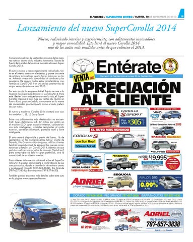 Lanzamiento del nuevo SuperCorolla 2014 Nuevo, rediseñado interior y exteriormente, con aditamentos innovadores y mayor comodidad. Esto hará al nuevo Corolla 2014 uno de los autos más vendidos antes de que culmine el 2013. Comenzamos el mes de septiembre con una de las mejores noticias dentro de la industria iutomotriz: Toyota de Puerto Rico acaba de lanzar al mercado el nuevo SuperCorolla 2014. El auto es nuevo y está completamente rediseñado, tanto en el interior como en el exterior, y posee una serie de aditivos innovadores que lo hacen único en su clase. Además, ofrece más comodidad al conductor y los pasajeros. De seguro, todas estas características convertirán al Corolla 2014 en uno de los automóviles de mayor venta durante este año 2013. Por esta razón la empresa Adriel Toyota se une a la llegada más esperada del año: el Corolla 2014. Para este ‘dealer’ y sus concesionarios en la isla, el SuperCorolla impulsará aun más las ventas de Toyota en Puerto Rico, posicionándolo nuevamente en la mente del consumidor puertorriqueño como el auto preferido por todos. El nuevo y moderno Corolla 2014 contará con cuatro modelos: L, LE, LE Eco y Sport. Entre sus aditamentos más destacados se encuentrab: luces delanteras led, 42 millas por galón en el modelo ECO, gran espacio interior, características más inteligentes, cristales resistentes al ruido exterior, conexión Bluetooth, pantalla táctil y llave inteligente. El auto estará disponible a partir del lunes, 16 de septiembre en los concesionarios Adriel Toyota de Dorado, Río Grande y Barranquitas. Allí los clientes tendrán la oportunidad de explorar las nuevas características y detalles del Corolla 2014, además de que podrán realizar una prueba de manejo (‘test-drive’) para comprobar no solo su gran potencial, sino la comodidad de su diseño interior. Para obtener información adicional sobre el SuperCorolla 2014, puedes comunicarte o visitar alguno de sus concesionarios, donde te atenderán de manera atenta y profesional: Dorado (787-626-3838), Río Grande (787-657-3838) y Barranquitas (787-857-4430). También puedes encontrar más detalles sobre este auto en la página www.supercorolla.com.