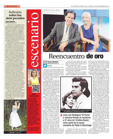 adolescente, joven adulto, adulto o personas maduras. En esta etapa somos viejos yrodriguez@elvocero.com y hasta llegaremos a ancianos cuando entremos en los 80 años. Pero es simple@yomarisr mente parte de la vida, la cosa es vivirla con alegría, entusiasmo y con ganas de seguir descubriendo cosas”, enfatizó. Ella está a favor de la palabra ‘viejo’ ‘El Puma’ se pasa ofreciendo conciertos y él prefiere que lo llamen ‘adulto conen diversos países y revela cómo obtiene la temporáneo’. Este cómico debate entre la energía necesaria para lograrlo a su edad. actriz puertorriqueña Johanna Rosaly y “De Dios y de la alimentación, tu cuerJosé Luis Rodríguez ‘El Puma’ se suscitó po es lo que le mandas, el ciclo ayer durante la presentación de de vida está llegando hasta 95 la campaña ‘Todo cambia’, de años, a una persona de 75 y 80 Triple-S Advantage. años no le puedes decir anciana Esta iniciativa los reunió en ahora porque están activas. Para la pantalla luego de 37 años de la mí no son ancianos, un anciano transmisión de la telenovela ‘Crispuede ser de 90 y 95 años y hasta tina Bazán’, que protagonizaran 100. Van a ver cómo se va a propor Telemundo. En el comercial longar la vida con los descubrirecrean la presentación de la nomientos y, sobre todo, por el tipo vela, comparando así las escenas de alimentación de las personas. originales con la actualidad recoMientras menos comida chatarra rriendo diversos lugares de San coman mejor, hay una energía Juan en un auto convertible azul, insospechada que tiene el cuermuy parecido al del pasado. po con la alimentación”, explicó. El grato encuentro acontece Este le lleva a su esposa 23 luego de 11 años sin verse, así años y dice bromeando que ella que los recuerdos son muchos. lo está alcanzando. En cuanto “Me ha traído memorias de a si se siente más joven dijo que lo que sucedió hace 37 años y la “la verdad hay que tomar la vida verdad me ha hecho ver cuánto con una actitud positiva siempre, ha cambiado el entorno nuestro y lo que ves arrugado verlo liso, hasta de la manera en que se hace donde están las montañas ves lo la televisión”, comentó Johanna, plano, o sea que, esa es la fe, es cuya la última novela fue en 1980. la convicción de lo que no estás Por su parte, ‘El Puma’ agregó que “después de ‘Cristina ‘Todo cambia’ celebra la telenovela de 1978, así como el conocimiento viendo, pero sabes que está ahí”. Finalmente, al parecer van a Bazán’ hice ‘El ídolo’ y ‘Trópico’. y las habilidades que se desarrollan con los años. >Archivo trabajar algo juntos más allá de Después no hice más nada, la esta campaña porque Johanna mecánica de hacer telenoveadelantó “vamos a ver, creo que las no ha cambiado mucho, es hay algo caminando por ahí”. un libro, es una historia que, Mientras, él añadió que podría por cierto, ya no encuentran ser “un capítulo o dos”. de dónde sacar historias, las ‘Todo Cambia’ celebra esta sacan del pasado y las ponen telenovela así como el conocien el presente, lo que cambian miento y las habilidades que se son las personas. Pero como exdesarrollan con los años, conperiencia de vida para mí, que virtiendo a las personas en exno estudié actuación, fue muy pertos en diversas áreas. importante, aprendí con los “Tenemos que dejar de un lado los El domingo, a las 10:00 pm, Telecompañeros preguntándoles cómo decía las cosas y de repente era un poquito eufemismos, de cierta edad, persona mundo transmitirá un especial, en el engolado, acartonado, porque así era la adulta; viejo no tiene que ser malo, es una que se resumen los últimos tres capítuetapa de la vida como es ser bebé, niño, los de la telenovela. época, no era tan natural como ahora”.