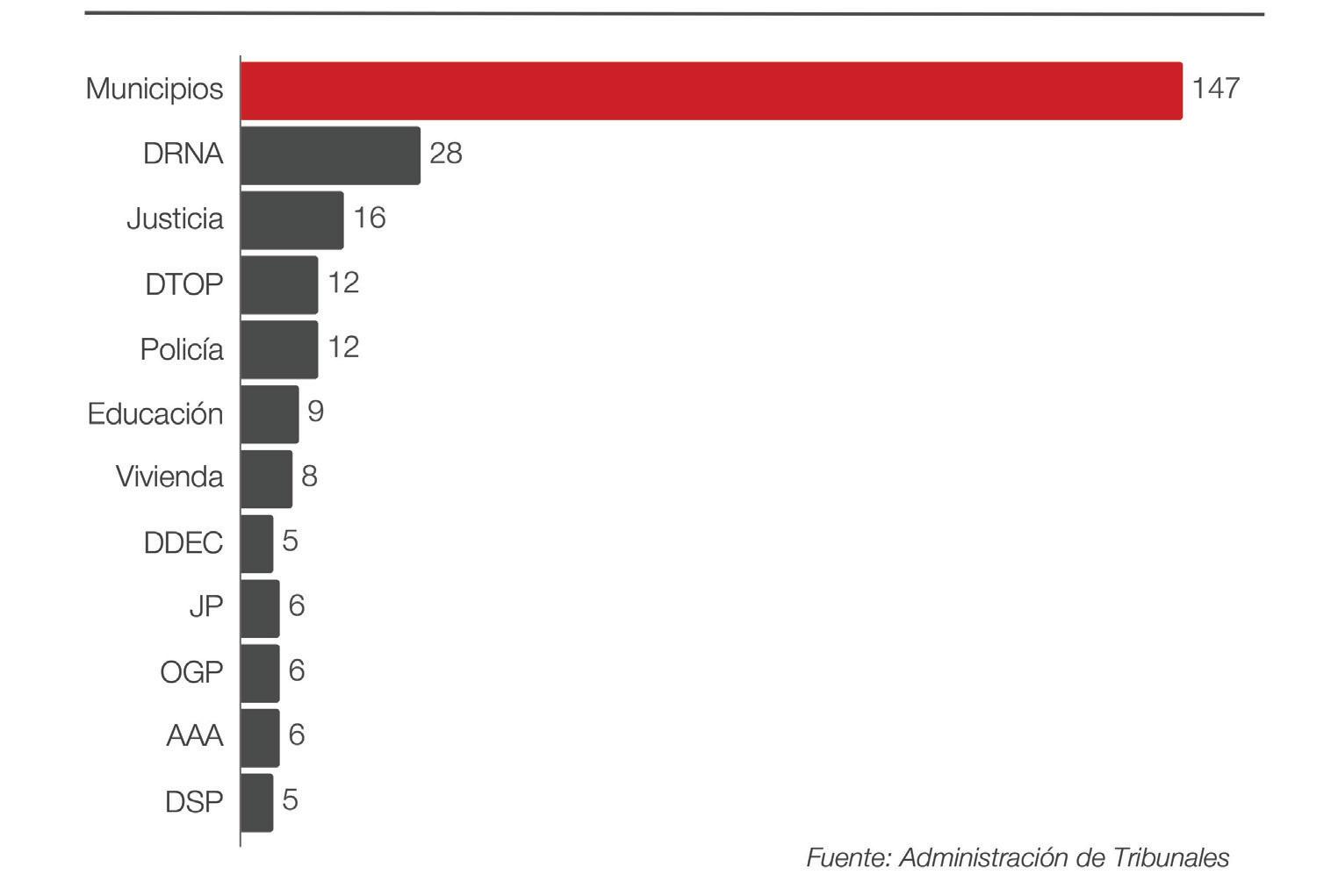 También se halló que se presentaron 8 demandas contra los Departamentos de Vivienda, Salud y Desarrollo Económico y Comercio (DDEC); 5 contra el Departamento de Seguridad Pública (DSP); y 6 contra la Junta de Planificación, la Oficina de Gerencia y Presupuesto (OGP) y la Autoridad de Acueductos y Alcantarillados (AAA).