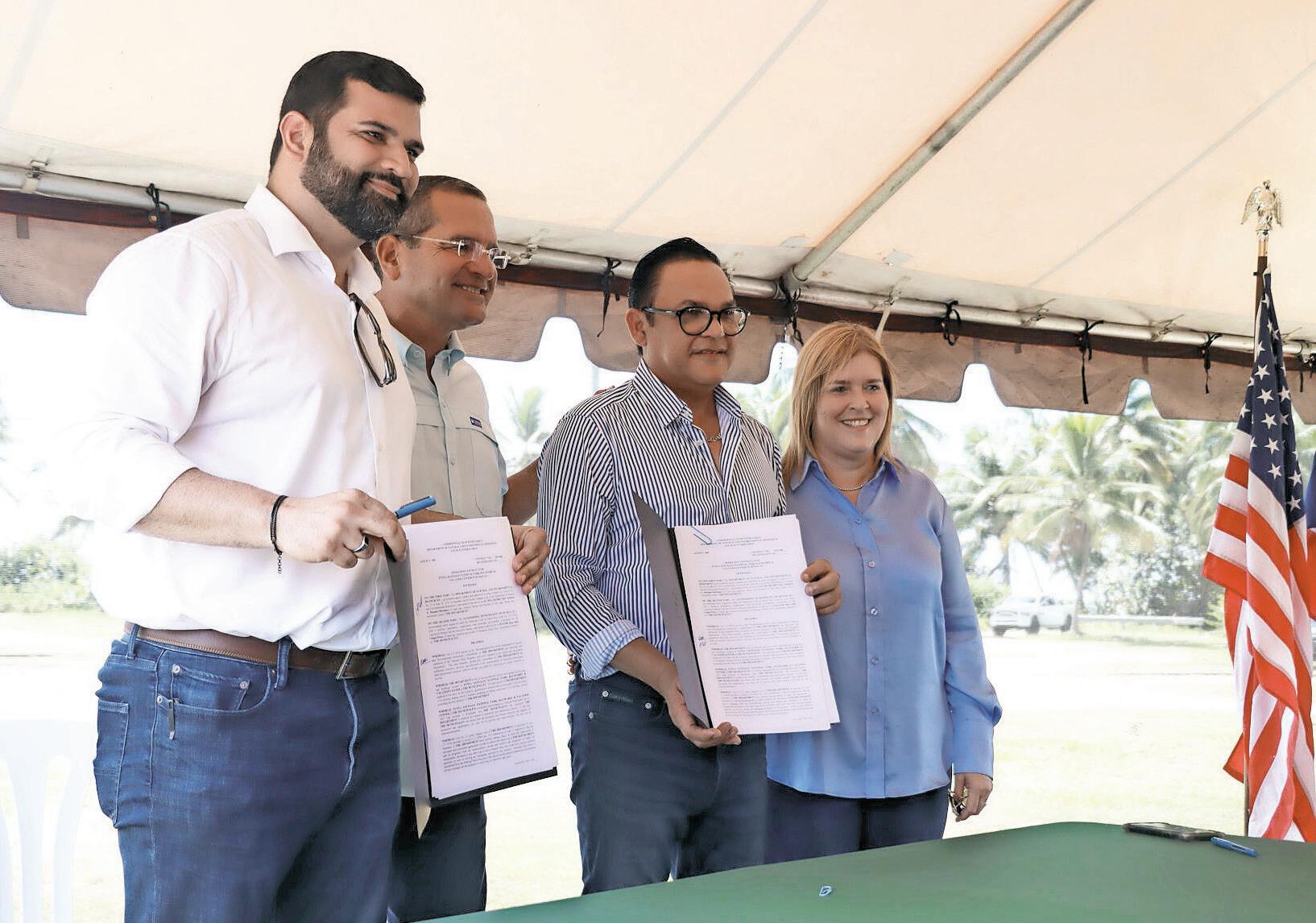 Durante la firma del acuerdo de traspaso, desde la izquierda, el secretario Interino del DRNA, Robert Méndez, el gobernador Pierluisi, el alcalde de Humacao, Julio Geigel y la senadora Wanda Soto. >Rocío Fernández Urbina / EL VOCERO