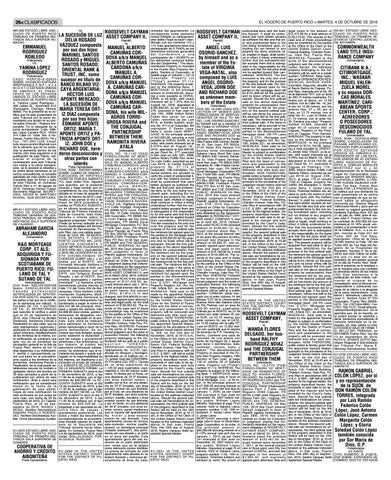 9-1/2% annual rate and due on January 1, 2018; as per Deed 191 executed in San Juan on December 28, 2007 before notary public William López Méndez. Recorded at page 73 of volume 1029 of Sabana Llana, property number 1149, 19th DE inEL VOCERO scription. Potential bidders are advised to verify the extent of preferential liens with the holders thereof. It shall be understood that each bidder accepts as sufficient the title and that prior and preferential liens to the one being foreclosed upon, including but not limited to any property tax, liens, (express, tacit, implied or legal), shall continue in effect it being understood further that the successful bidder accepts them and is subrogated in the responsibility for the same and that the bid price shall not be applied toward their cancellation. WHEREAS: The lien executed is the only one over the property and for the purpose of the first judicial sale, the minimum bid agreed upon by the parties in the mortgage deed will be $121,800.00 for the property and no lower offers will be accepted. Should the first judicial sale of the above described property be unsuccessful, then the minimum bid for the property on the second judicial sale will be two-thirds the amount of the minimum bid for the first judicial sale. The minimum bid for a third judicial sale, if the same is necessary, will be one-half of the minimum bid agreed upon the parties in the aforementioned mortgage deed. (30 PR Laws Ann. § 2721, Mortgage and Property Registry Act, Act. No. 198, Article 221, as amended). WHEREAS: Said sale to be made by the appointed Special Master is subject to confirmation by the United States District Court for the District of Puerto Rico and the deed of conveyance and possession to the property will be executed and delivered only after such confirmation. NOW THEREFORE, public notice is hereby given that the appointed Special Master, pursuant to the provisions of the Judgment herein before referred to, will, on the 2nd day of November, 2016, at 10:30 a.m., in the Office of the Clerk of the United States District Court, Room 150, Federal Building, Chardon Avenue, Hato Rey, Puerto Rico in accordance with 28 U.S.C. § 2001, will sell at public auction to the highest bidder, the property described herein, the proceeds of said sale to be applied in the manner and form provided by the Courtʼs Judgment. Should the first judicial sale set hereinabove be unsuccessful, the second judicial sale of the property described in this Notice will be held on the 9th day of November, 2016, at 10:30 am, in the Office of the Clerk of the United States District Court located at the address indicated above. Should the second judicial sale set hereinabove be unsuccessful, the third judicial sale of the property described in this Notice will be held on the 16th day of November, 2016, at 10:30 am, in the Office of the Clerk of the United States District Court located at the address indicated above. In San Juan, Puerto Rico, this 26th day of August, 2016. Beatriz Vázquez Solís Appointed Special Master KV-2692 IN THE UNITED STATES DISTRICT COURT FOR THE DISTRICT OF PUERTO RICO